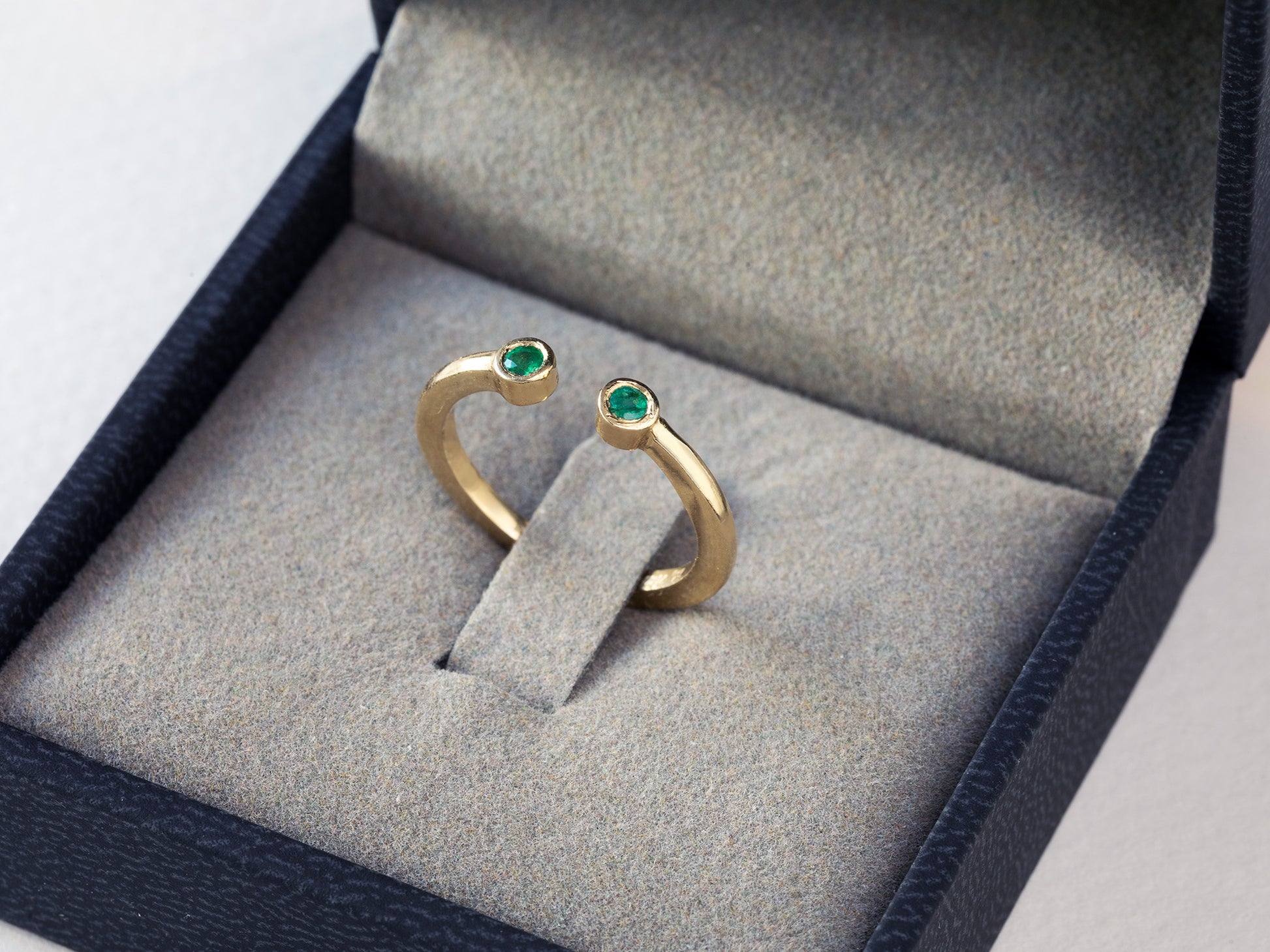 טבעת שילה המושלמת מעניקה לך מראה מתוחכם אבל שקט. טבעת זהב פתוחה שעשויה מפרופיל זהב מושטח ומעוגל שמסתיים בכל צד בכוס זהב המשובצת אבני רובי אדומות. טבעת שילה יפהיפיה לבדה או יחד עם עוד טבעות שמשלימות אותה.