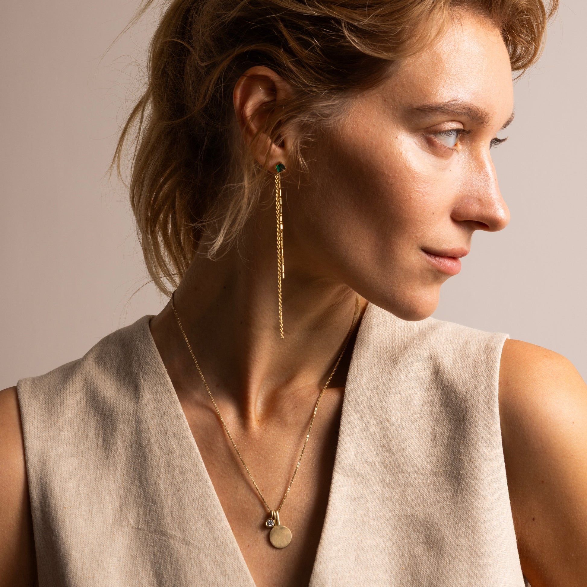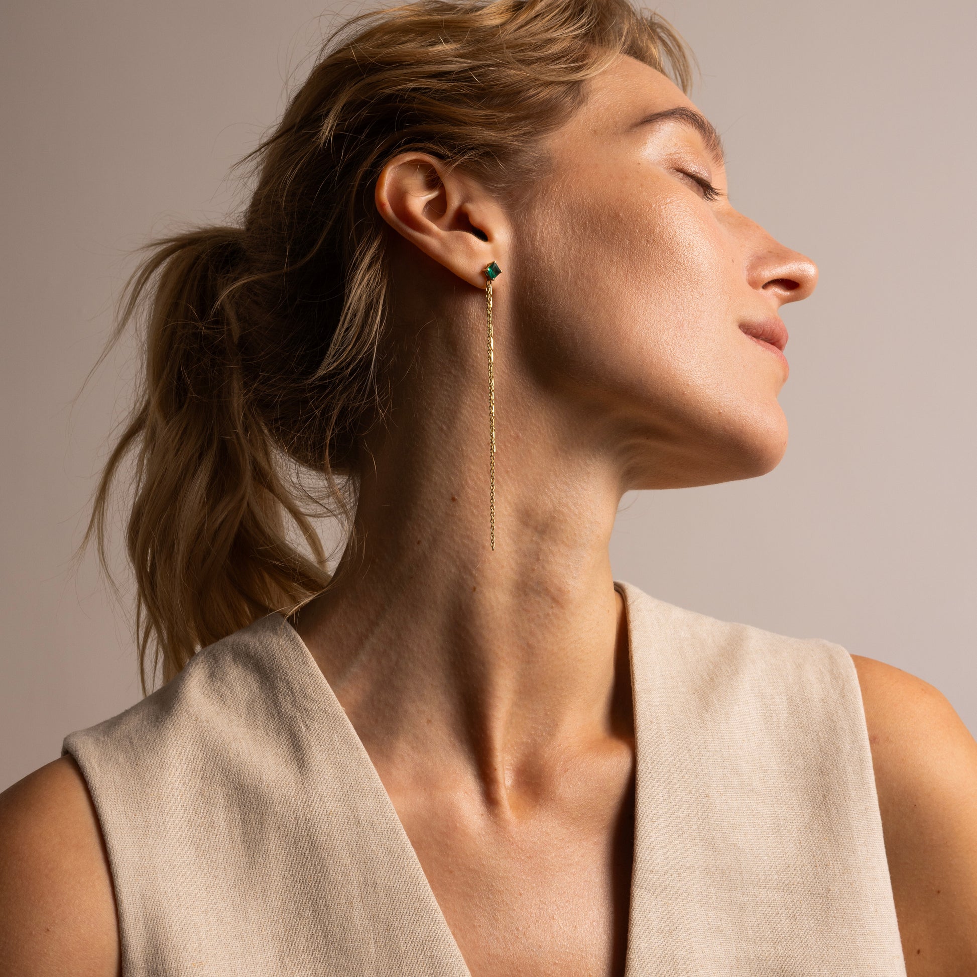 עגיל שרשרת זהב מושלם שלא יתחשק לך להוריד. אמרלד ירוק בצורת מעוין יושב צמוד לאוזן וממנו משתלשלת שרשרת חוליות זהב מלבניות מיוחדות