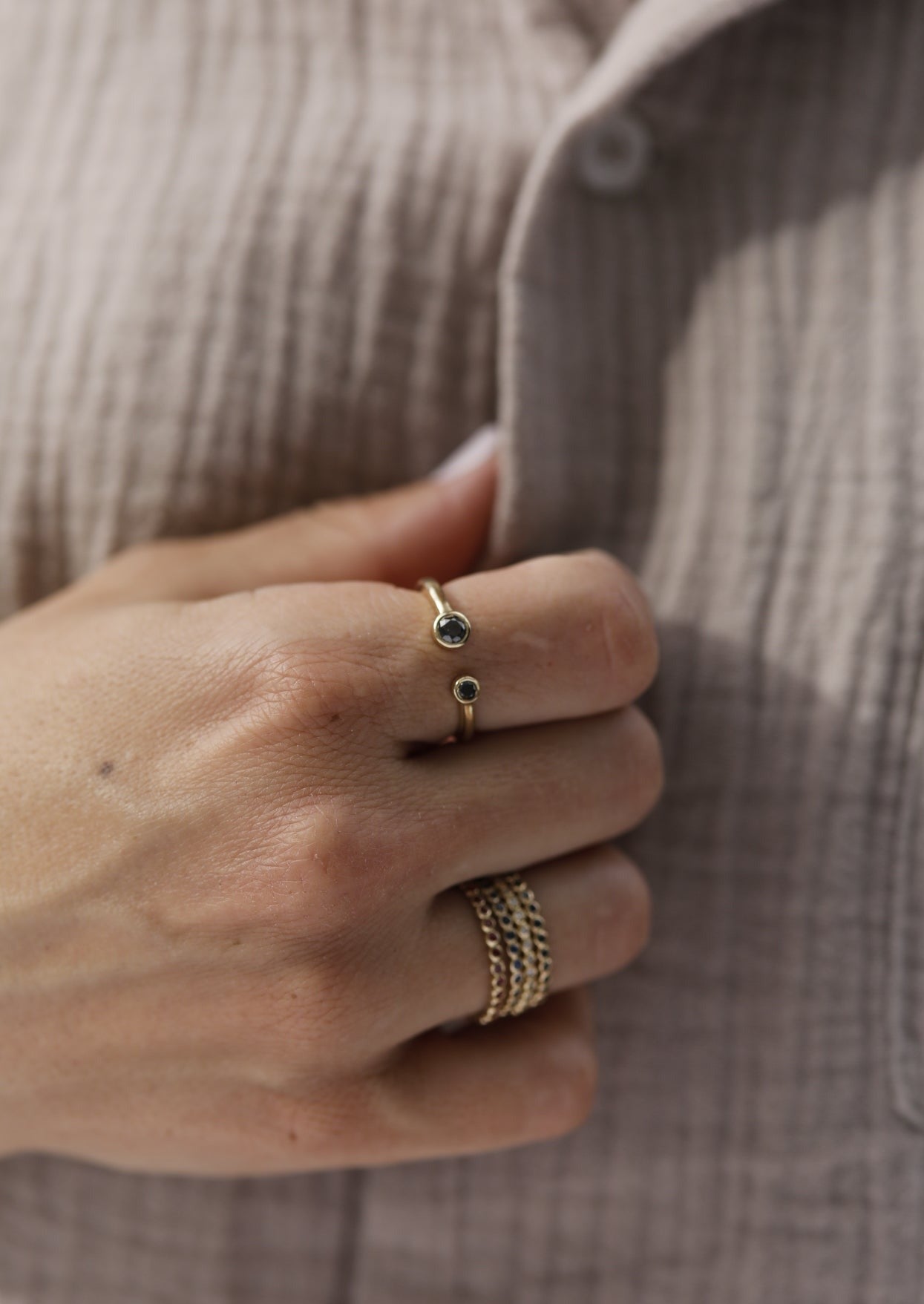 טבעת זהב שילה המושלמת מעניקה לך מראה מתוחכם ובועט. טבעת זהב פתוחה, מעוצבת בעבודת יד עם מבנה א- סימטרי עשויה מפרופיל זהב מושטח ומעוגל שמסתיים בכל צד בכוס זהב בגודל שונה המשובצות יהלומים שחורים