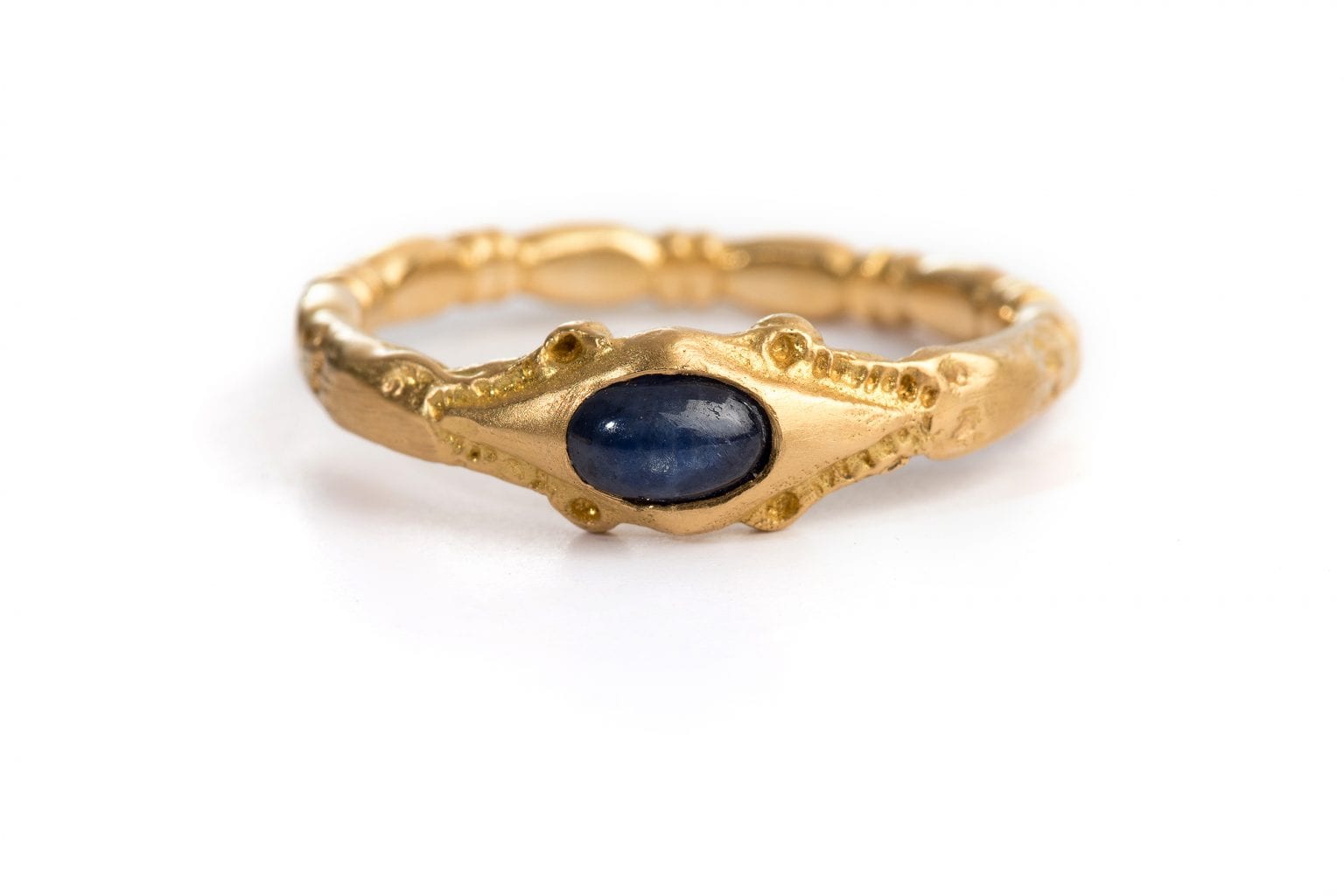 טבעת אן לוקחת אותנו אחורה בזמן למצריים העתיקה במראה הגולמי שלה ובעבודת הזהב שנעשתה עליה בעבודת יד מוקפדת ומדוייקת בסטודיו שלנו.  הטבעת משובצת במרכזה בספיר כחול בחיתוך קבוצון אובלי. זו טבעת מיוחדת במינה, יפהיפיה ומתאימה גם בתור טבעת לזרת.
