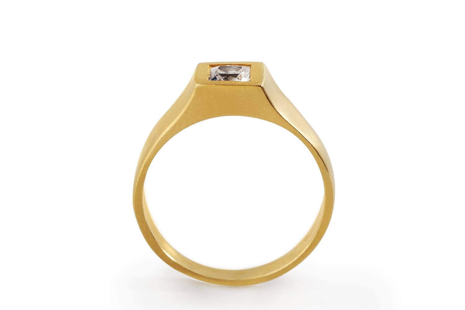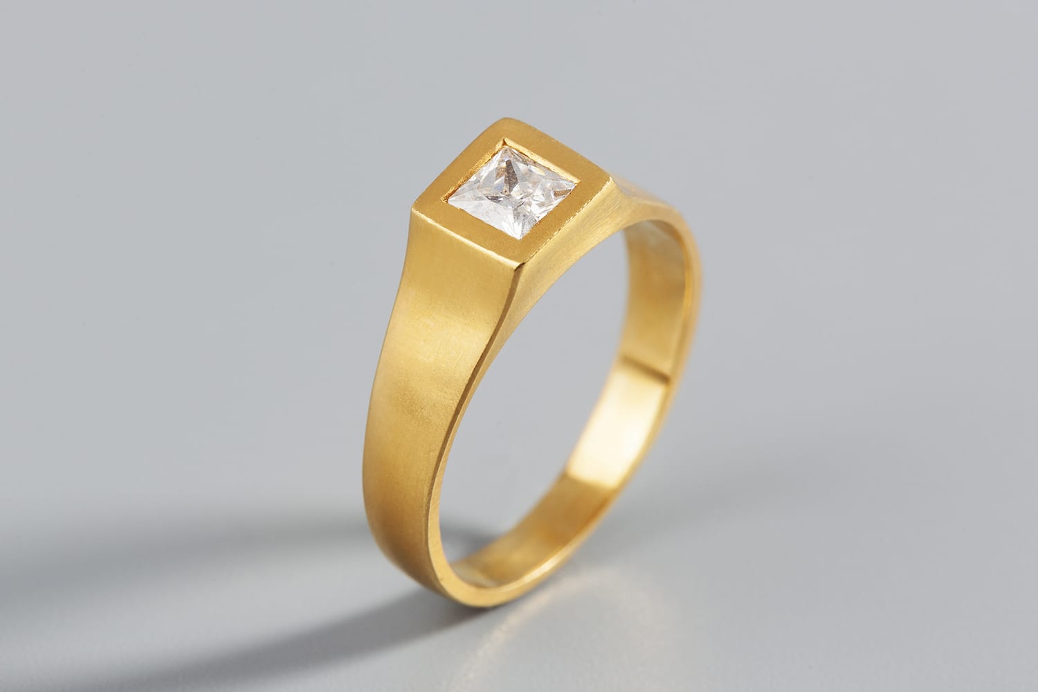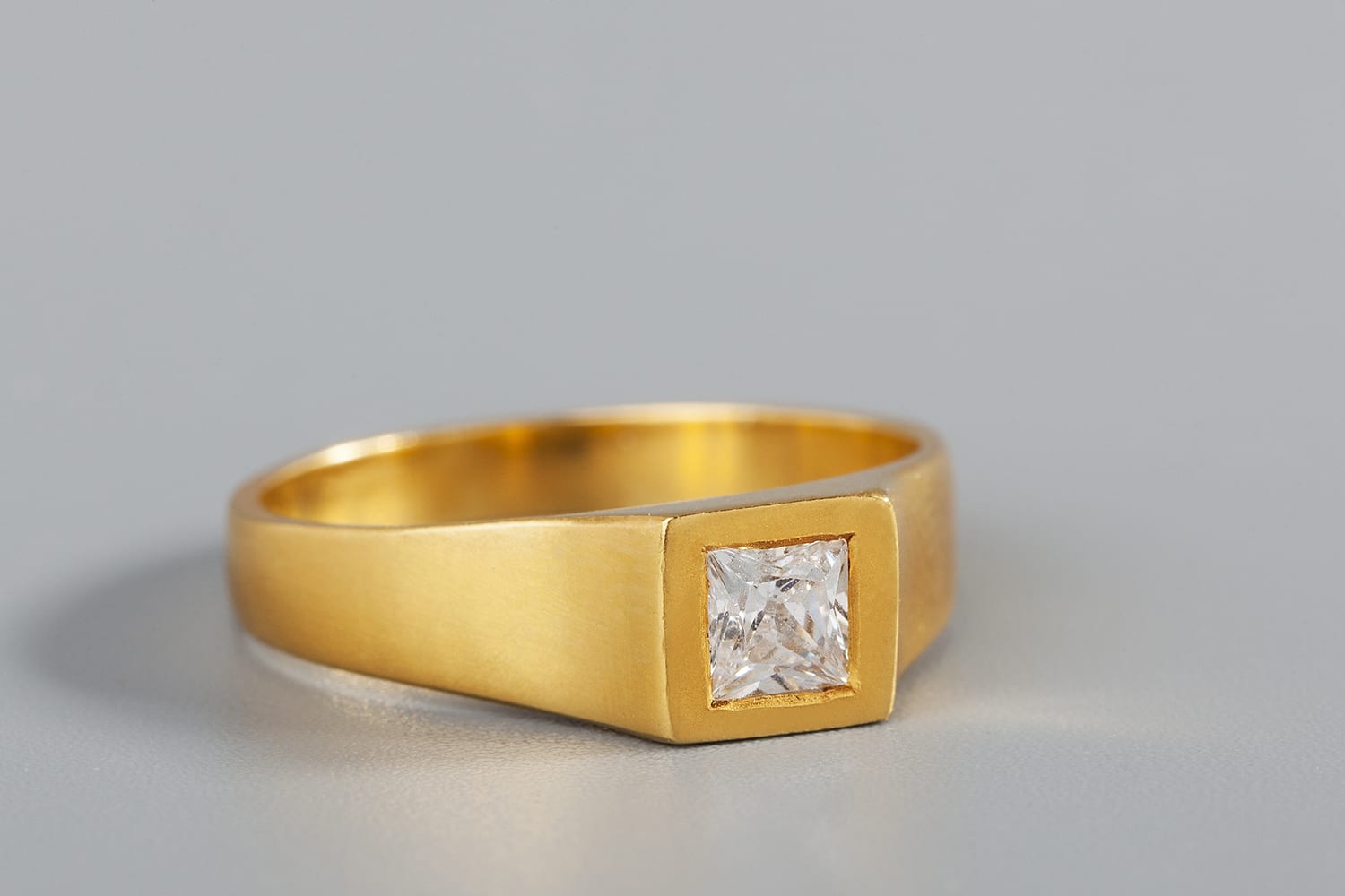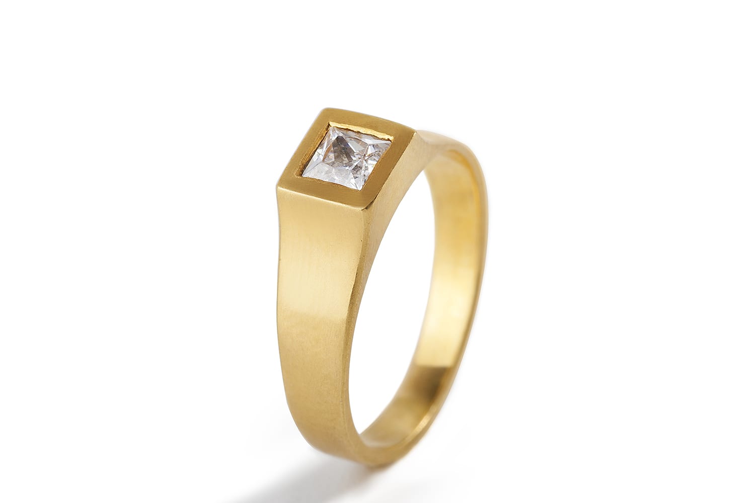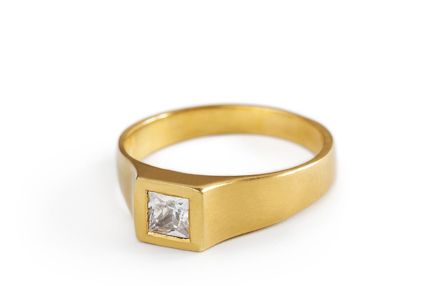 טבעת אירוסין מודרנית מהממת למי שאוהבת מראה יותר גאומטרי ונקי. מרכז הטבעת מוגבה ומשובץ יהלום מרובע בחיתוך פרינסס.