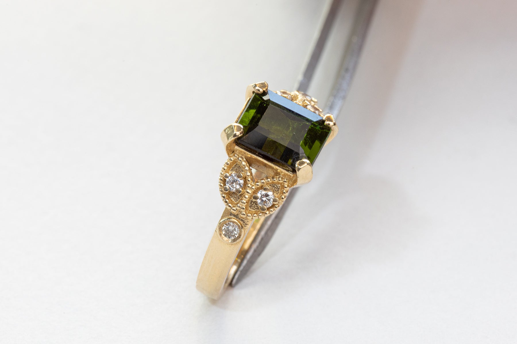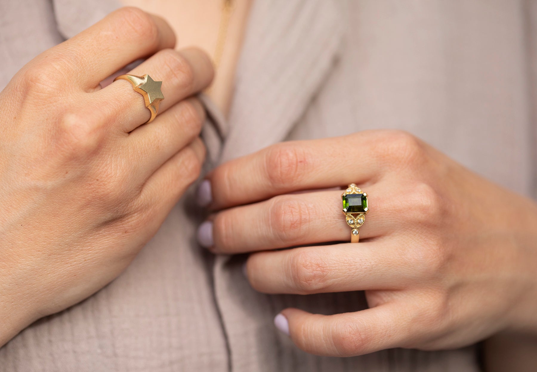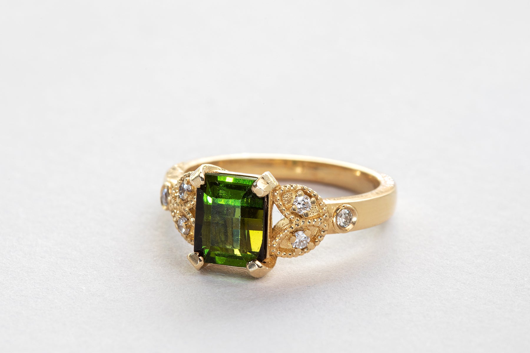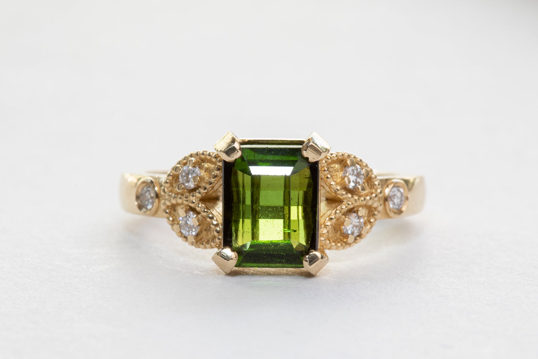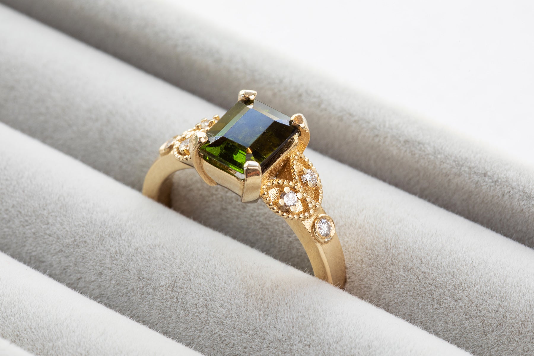 טבעת קוקטייל מרשימה ומיוחדת. טבעת זהב מעוצבת ומעודנת עשויה בעבודת יד מוקפדת אצלנו בסטודיו. טבעת זהב שבמרכזה אבן טורמלין ירוקה מלבנית, גדולה ומשגעת ומשני צידיה עלי זהב עדינים משובצים ביהלומים לבנים.