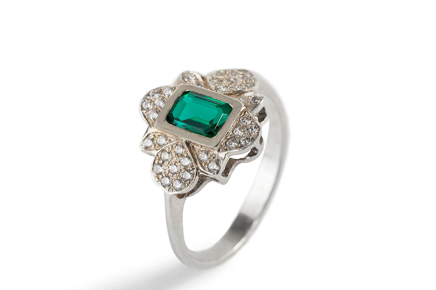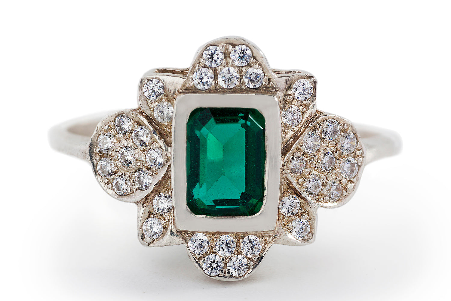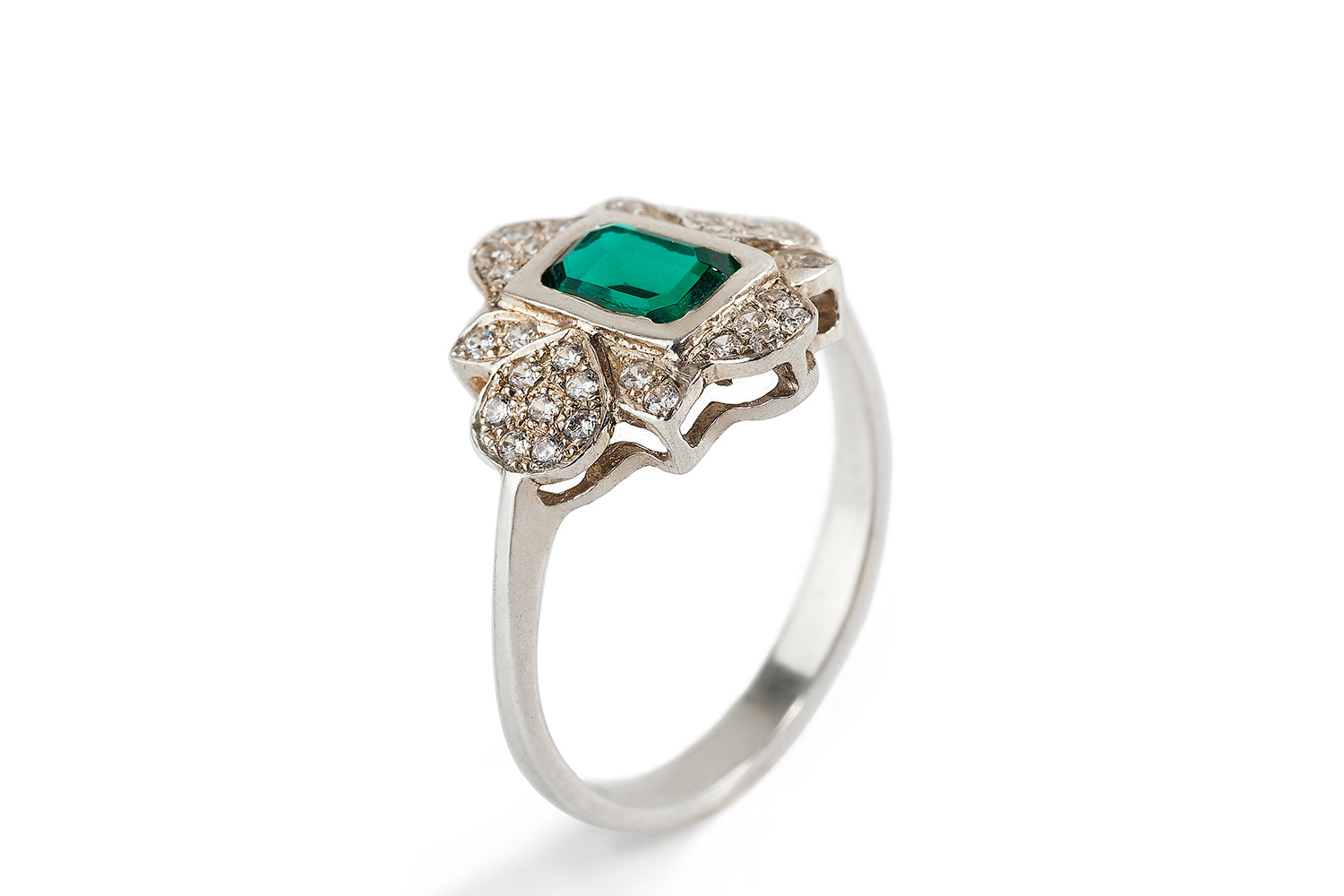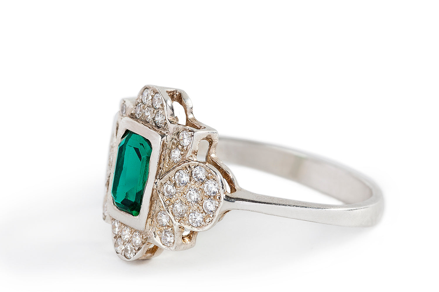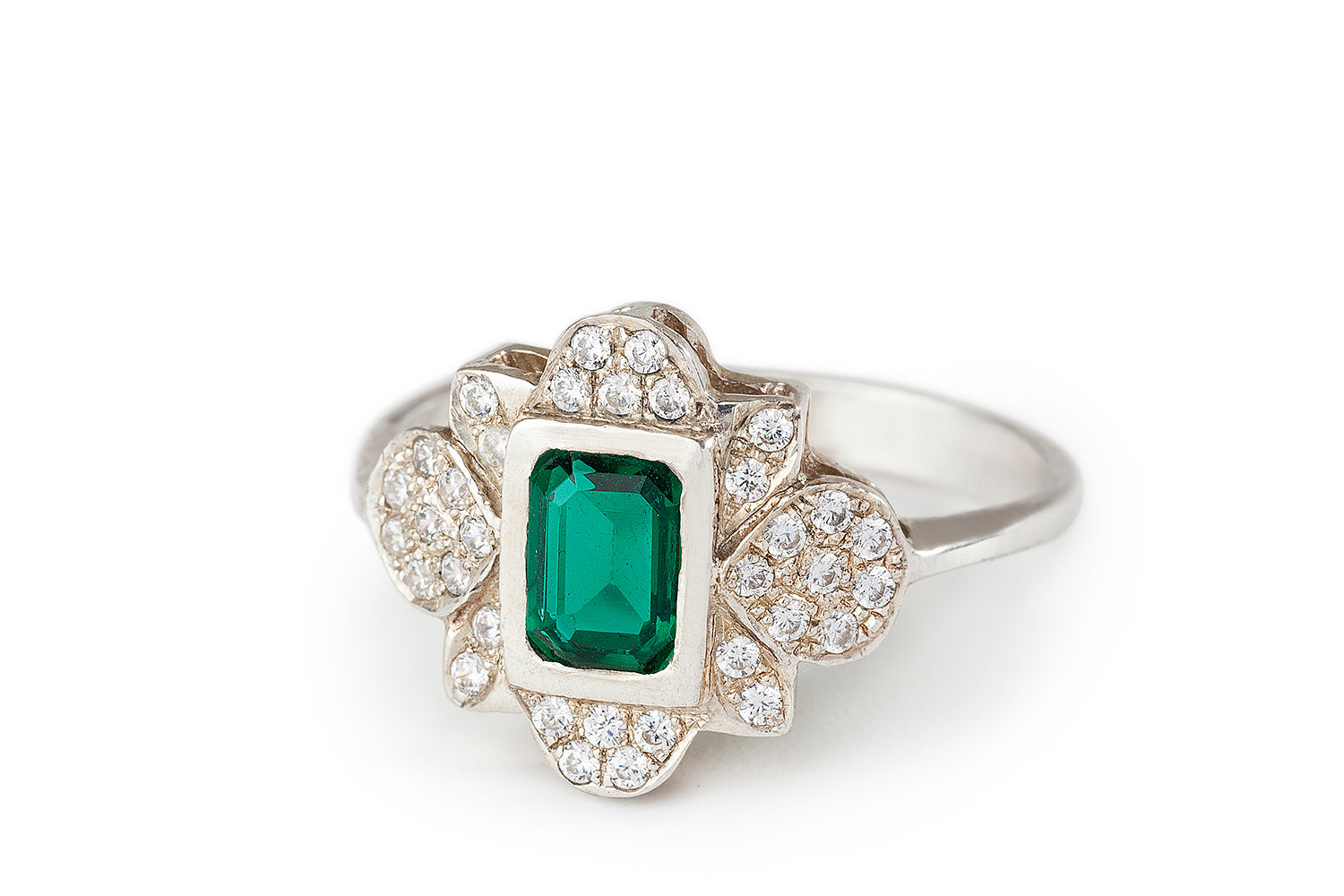 טבעת אלזה המדהימה מעוצבת בסגנון וניטאז׳. מושלמת כטבעת אירוסין ייחודית משובצת באבן אמרלד ירוקה ומוקפת יהלומים לבנים. ניתן להזמין גם בזהב צהוב או אדום.