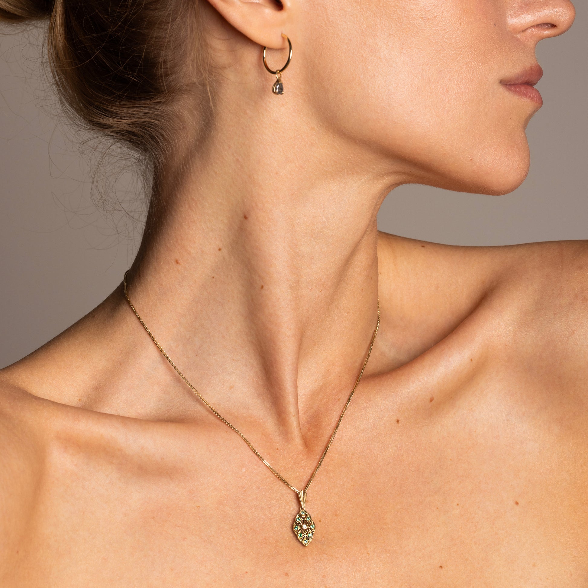 שרשרת ייחודית בסגנון וינטאז׳ בצורת מעויין, דוגמת התחרה מעניקה לתליון את המראה המיוחד והמעודן. התליון משובץ באמרלדים ירוקים שבמרכזם משובץ יהלום ותלוי על שרשרת חוליות קלאסית.