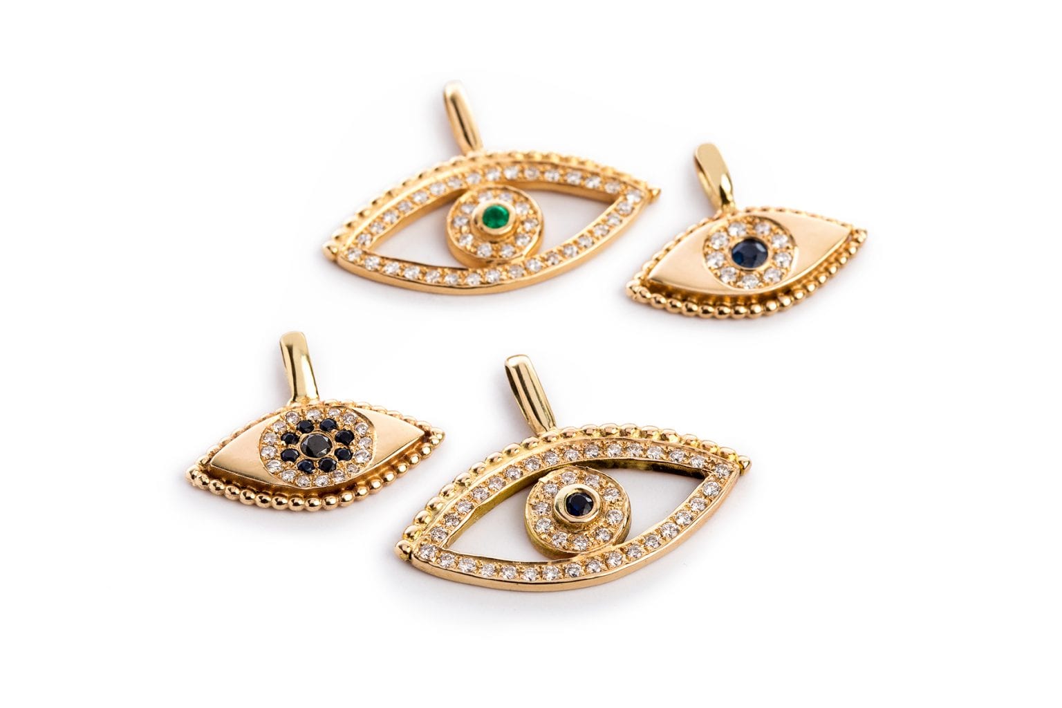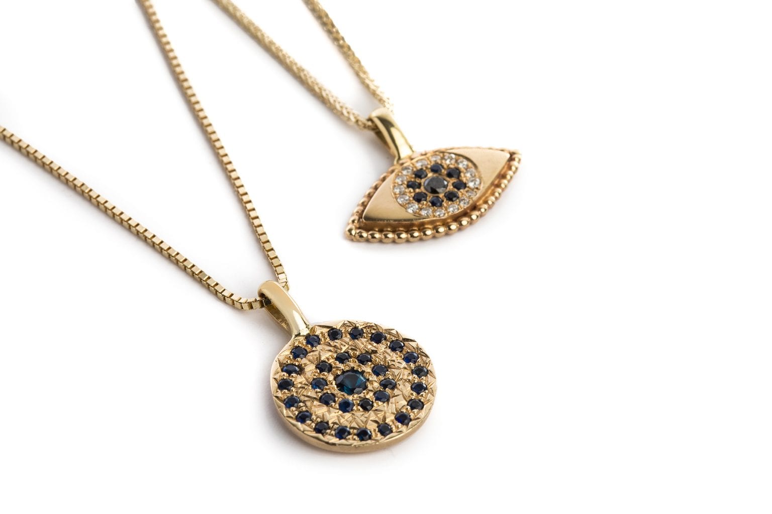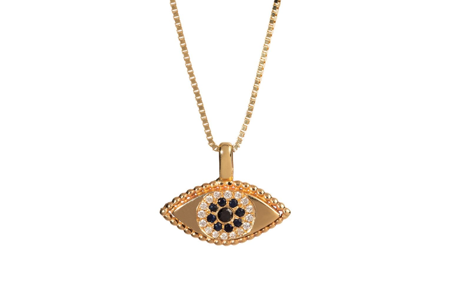שרשרת עין זהב מלאה שבמרכזה שלושה עיגולים משובצים ספירים כחולים ויהלומים שחורים ולבנים. העין עדינה אך מרהיבה.