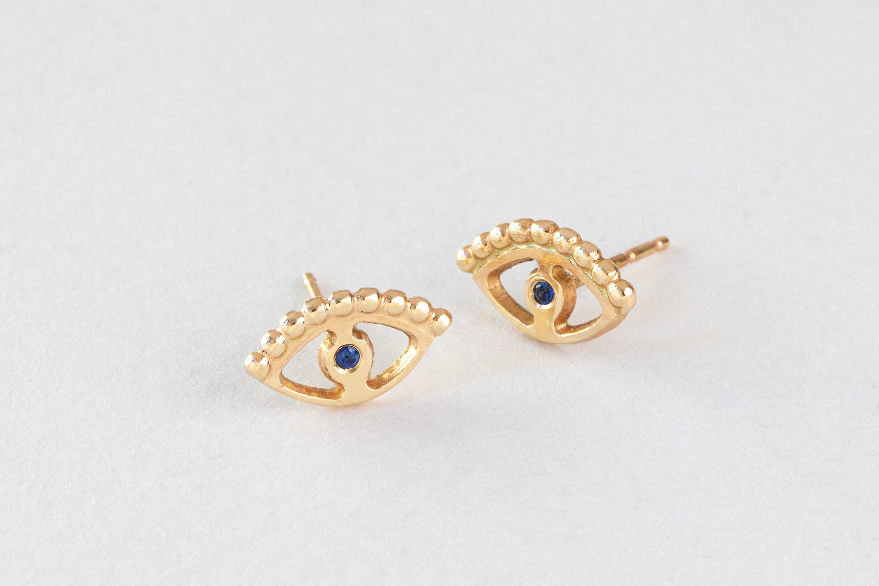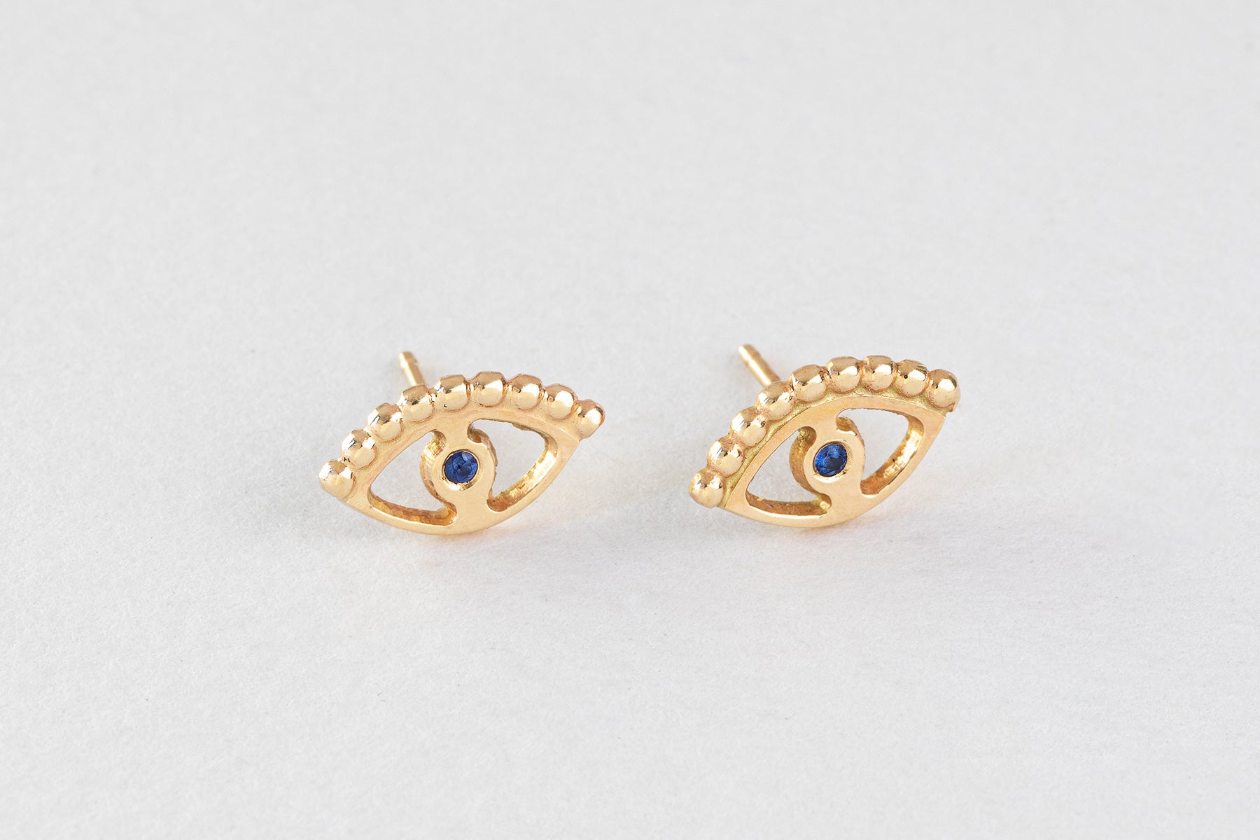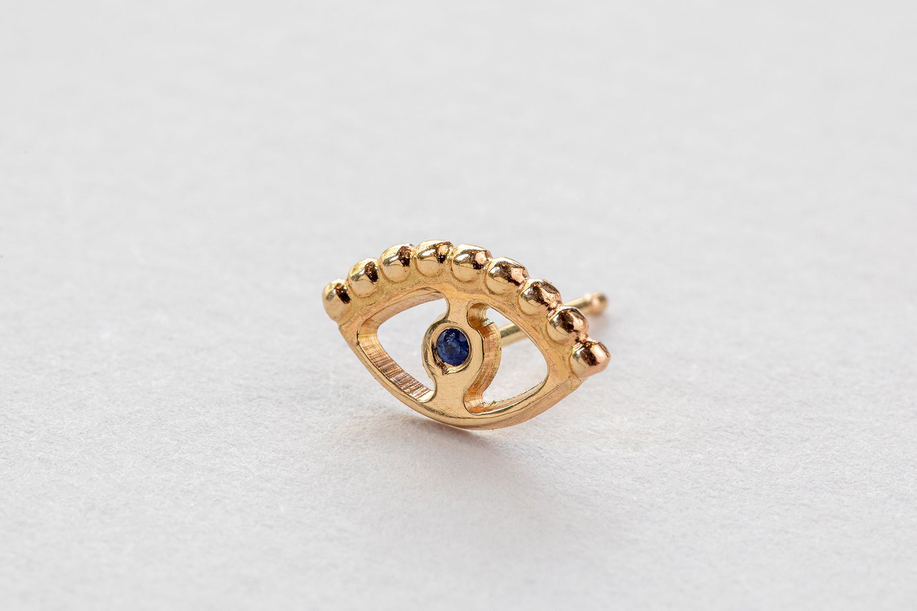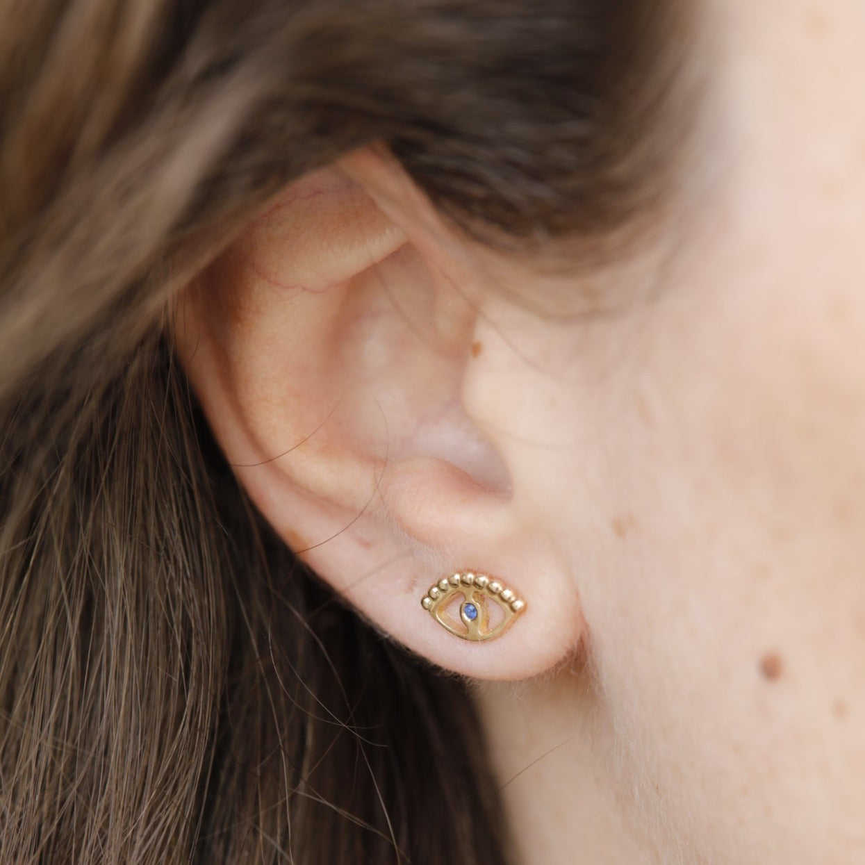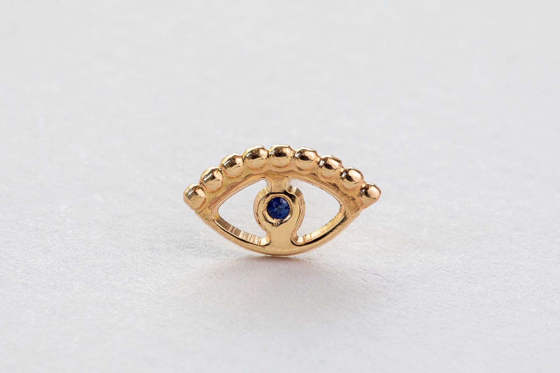 עגיל זהב עדין ומקסים בצורת עין פתוחה ומאווררת שבמרכזה משובצת אבן ספיר כחולה. ניתן לרכוש כזוג או כיחיד. אם את מעוניינת בשיבוץ אבן בצבע אחר או בשינוי כלשהו נשמח לעזור, צרי קשר בפרטי.