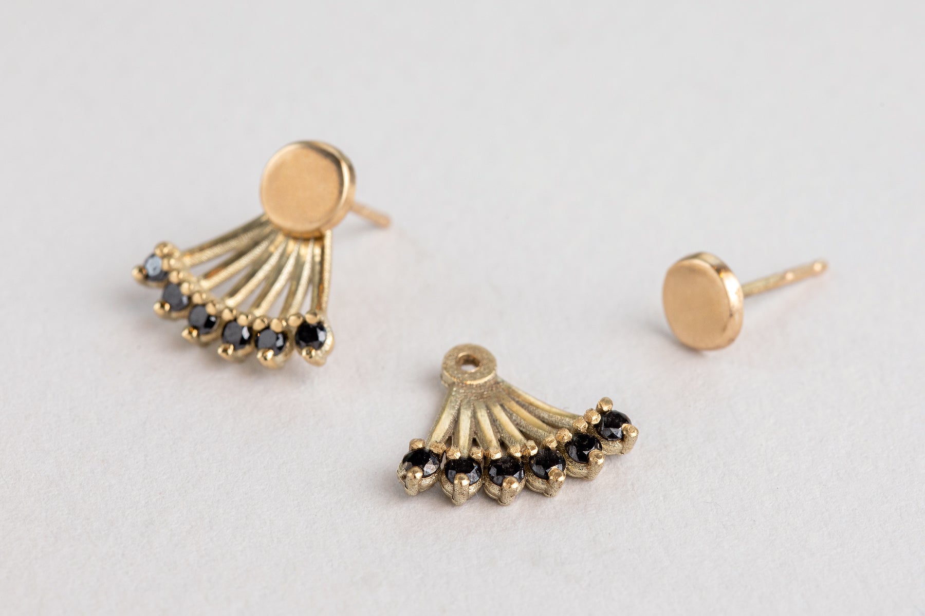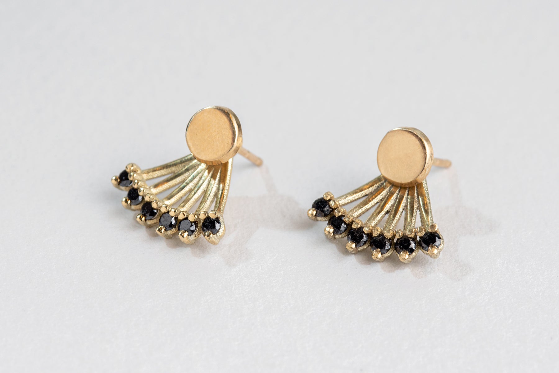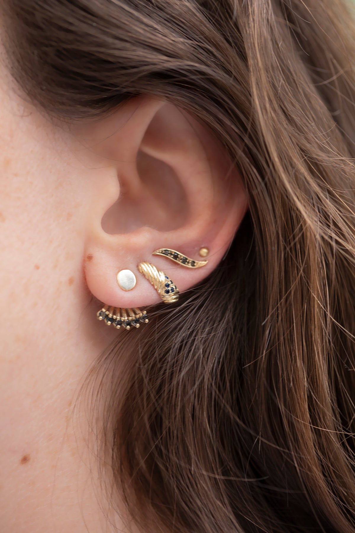 עגיל ייחודי ומתוחכם שמעניק מראה שיקי לאוזן שלך. העגיל המיוחד הזה מורכב מעגיל זהב עגול ושטוח צמוד אוזן שנכנס מקדמת האוזן ומניפת זהב עדינה המשובצת יהלומים שחורים שמורכבת מאחורי האוזן ומעניקה לעגיל את המשחקיות המגניבה שלו.