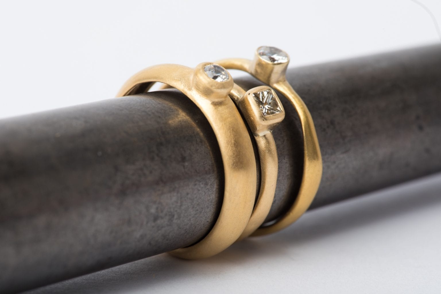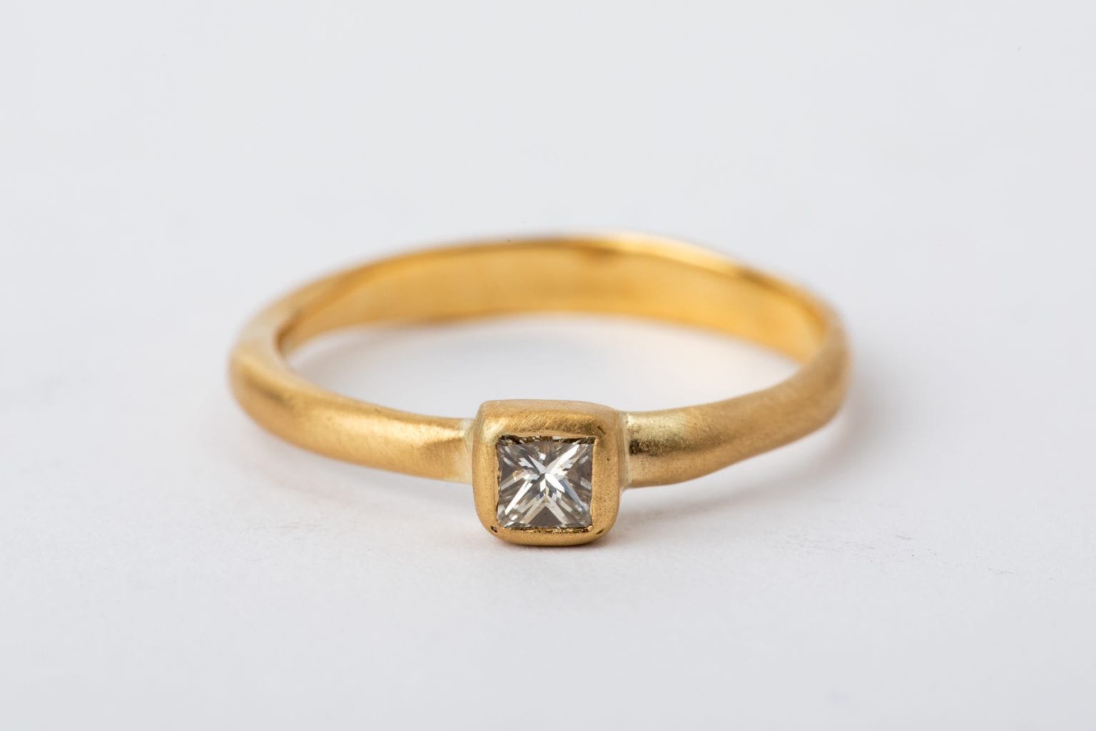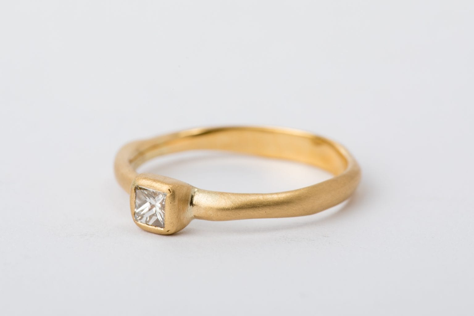 טבעת אירוסין עדינה ומיוחדת המשובצת יהלום מרובע. טבעת הלנה מיוצרת בעבודת יד בסטודיו שלנו והיא בעלת מבנה לא אחיד גולמי המעניק לטבעת מראה מעניין ומלא בתנועה. במרכז הטבעת כוס מרובעת מזהב המשובצת יהלום.