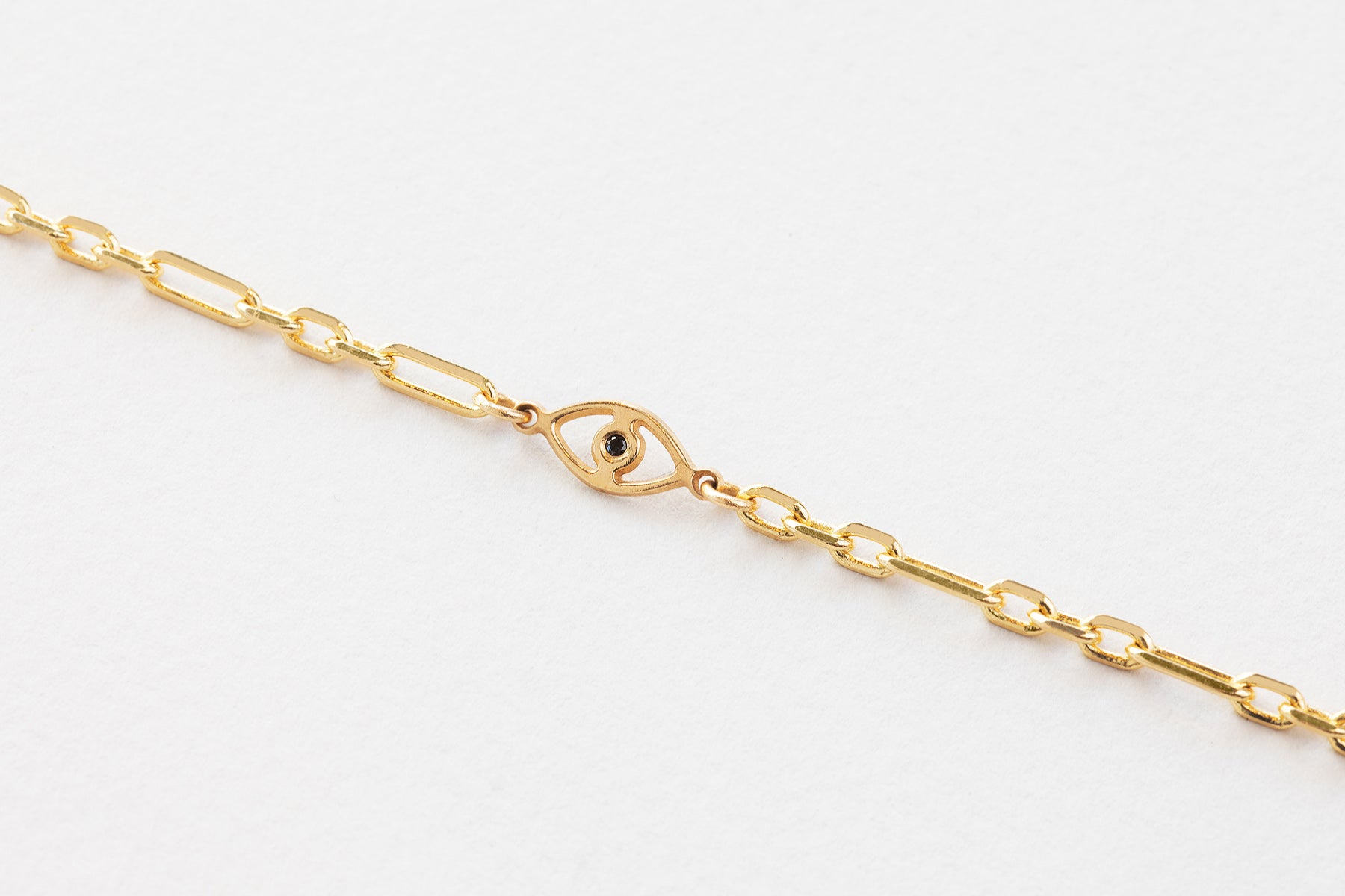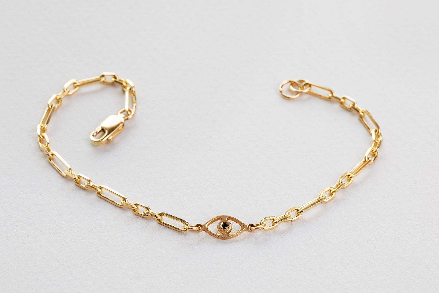 צמיד חוליות זהב מלבניות בגודל משתנהשבמרכזו עין זהב עדינה משובצת יהלום שחור. הצמיד עשוי חוליות זהב מושלמות ברצף של חולית זהב גדולה ואחריה שלוש חוליות זהב קטנות. אנחנו פשוט מאוהבות בצמיד הזה שמשדרג כל הופעה.