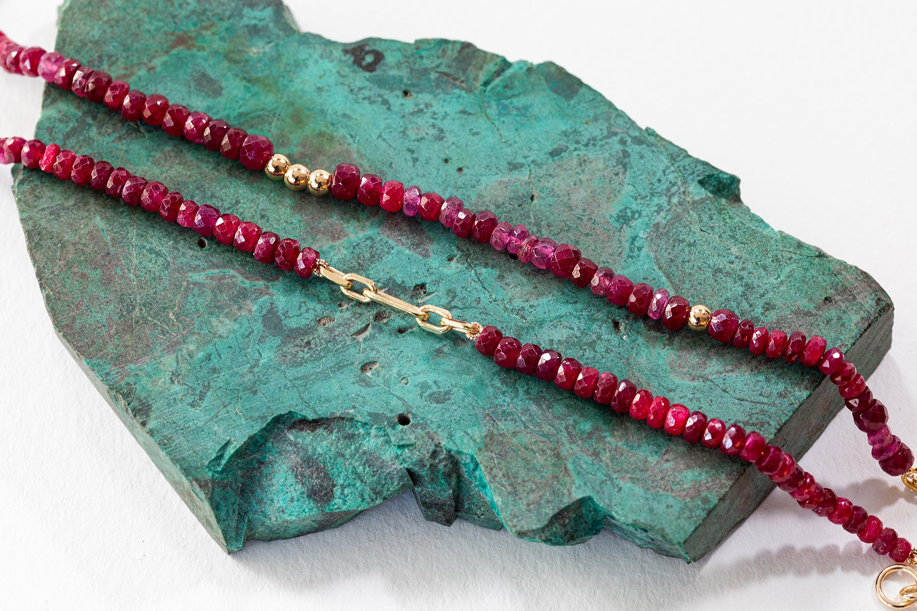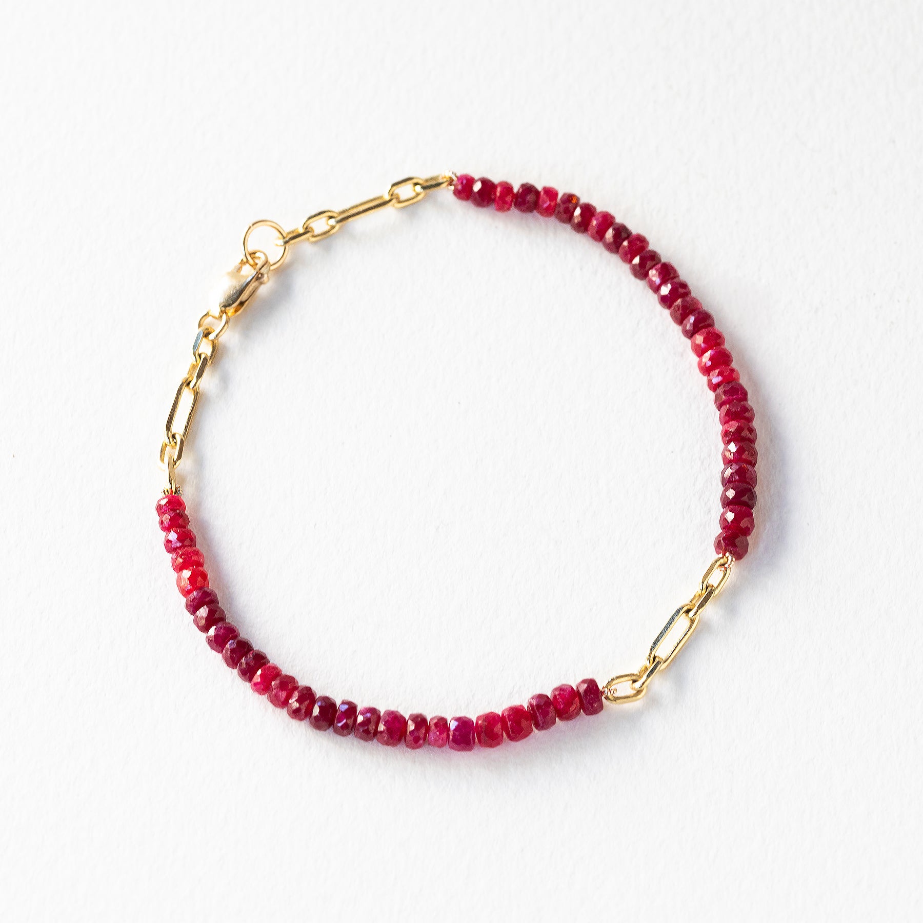 צמיד יפהיפה מלא צבע ונוכחות שישדרג לך את ההופעה הקיץ הזה. הצמיד עשוי חרוזי רובי טבעיים בצבע אדום ורוד מהמם ומשולב עם חוליות זהב בגדלים משתנים.