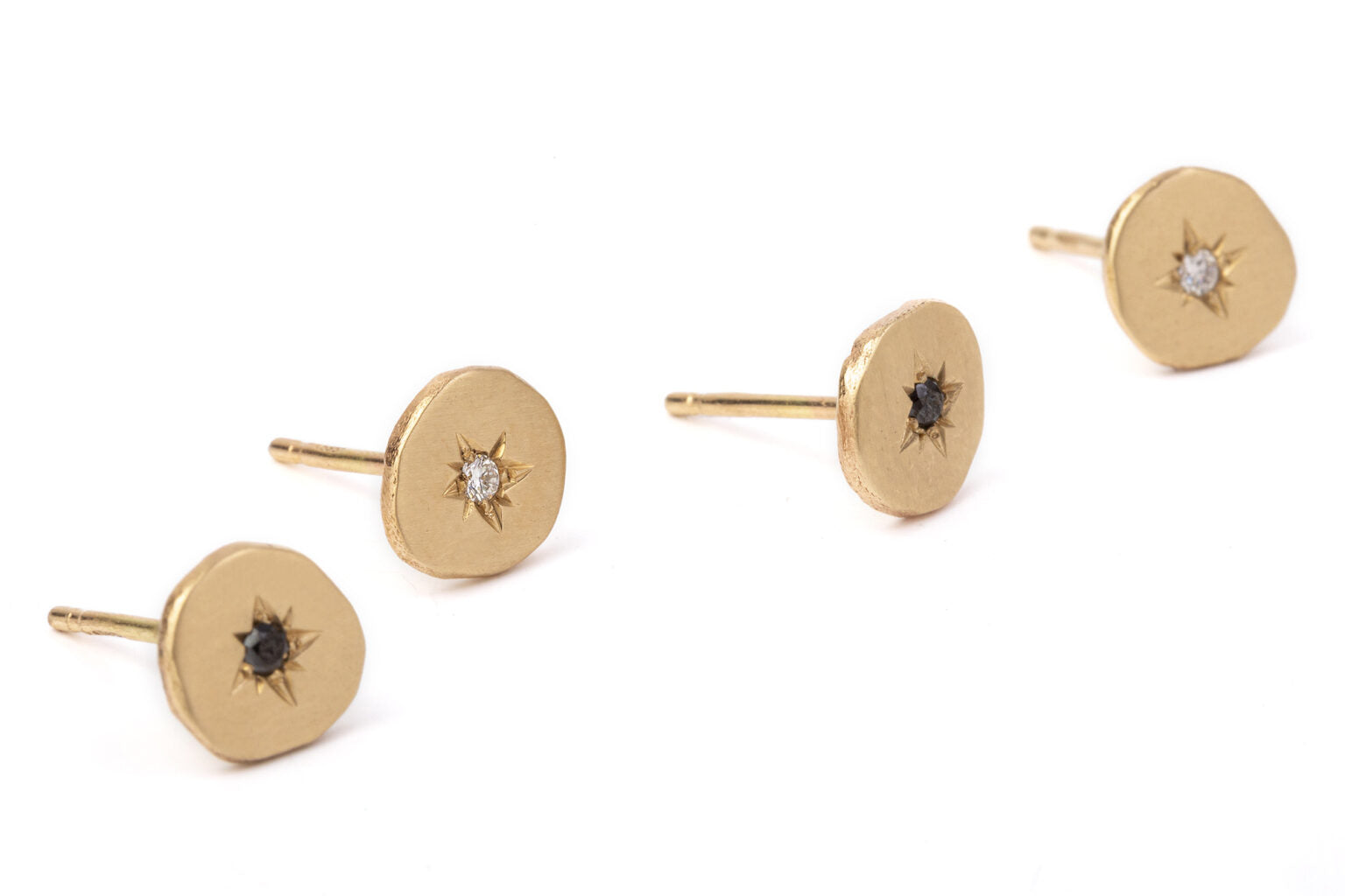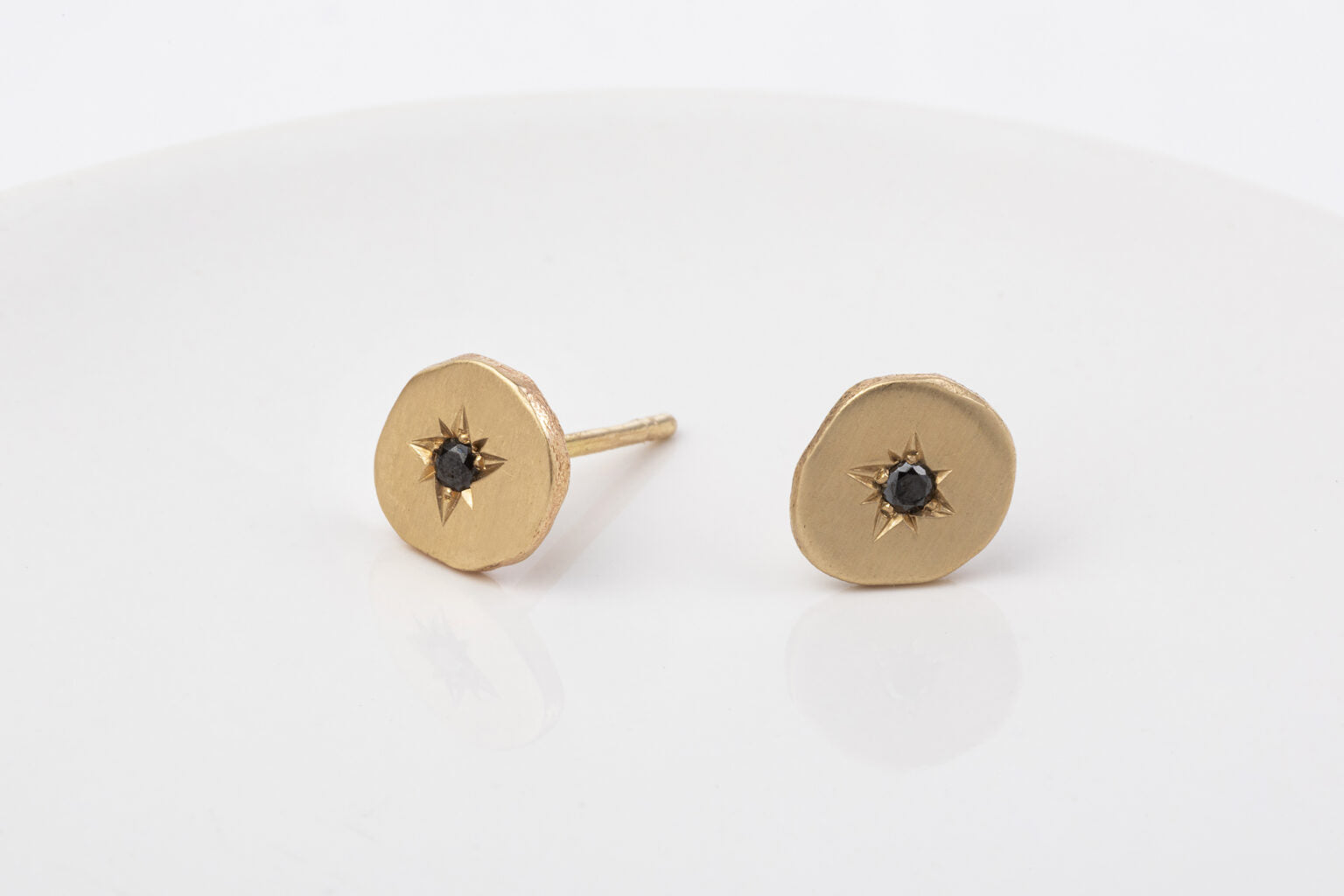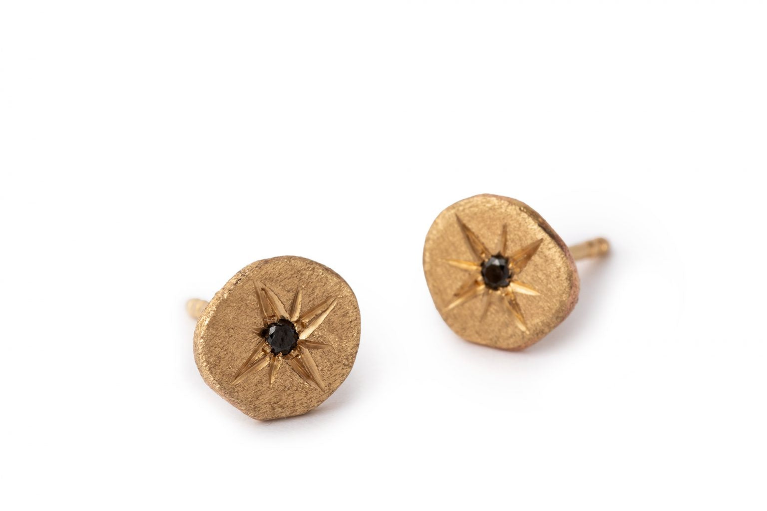 עגיל זהב עדין בצורת עיגול אמורפי המשובץ יהלום שחור בשיבוץ כוכב. העגיל עשויי בעבודת יד אחד אחד ויכולים להיות שינויים קלים בצורתם.