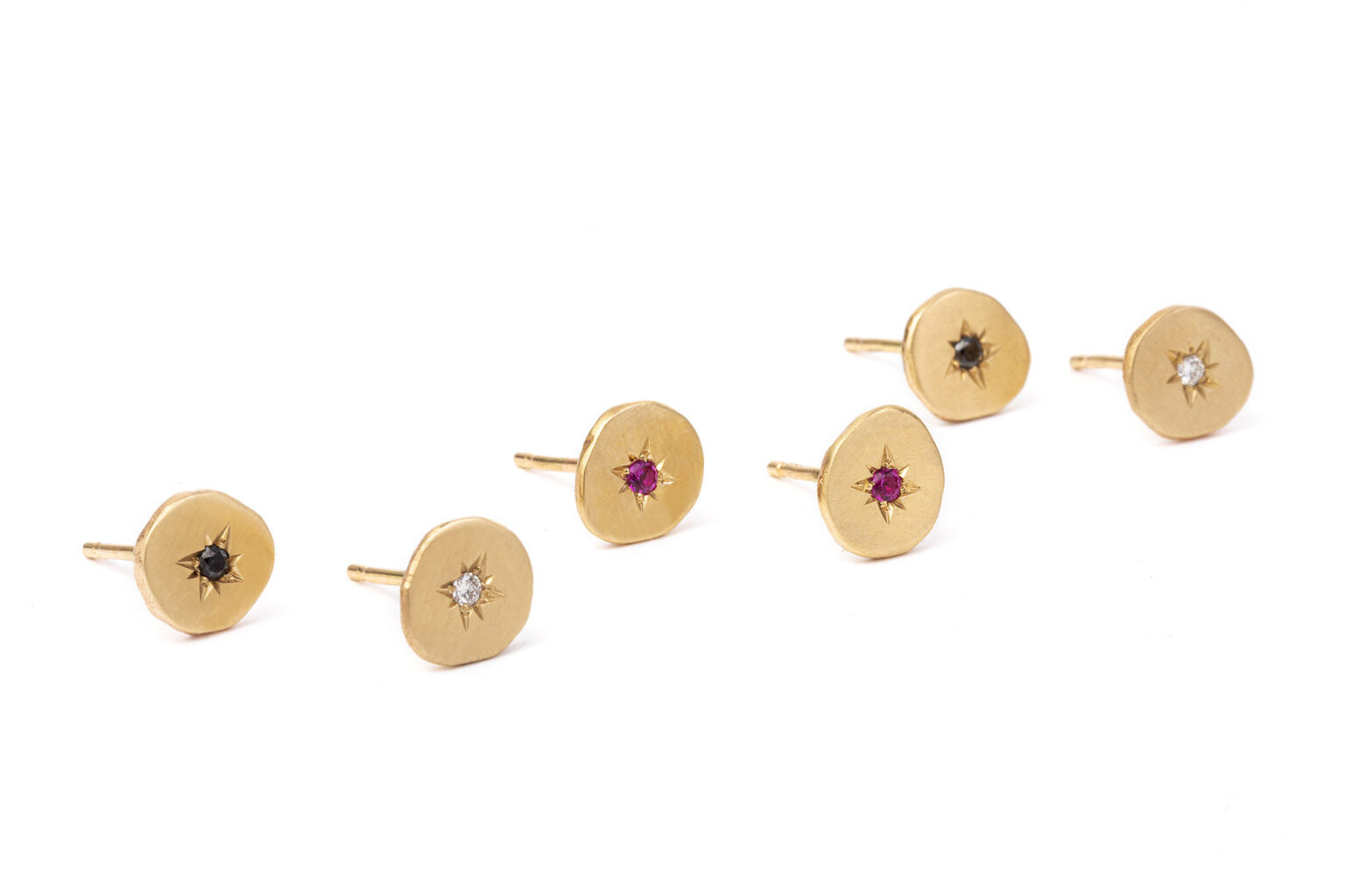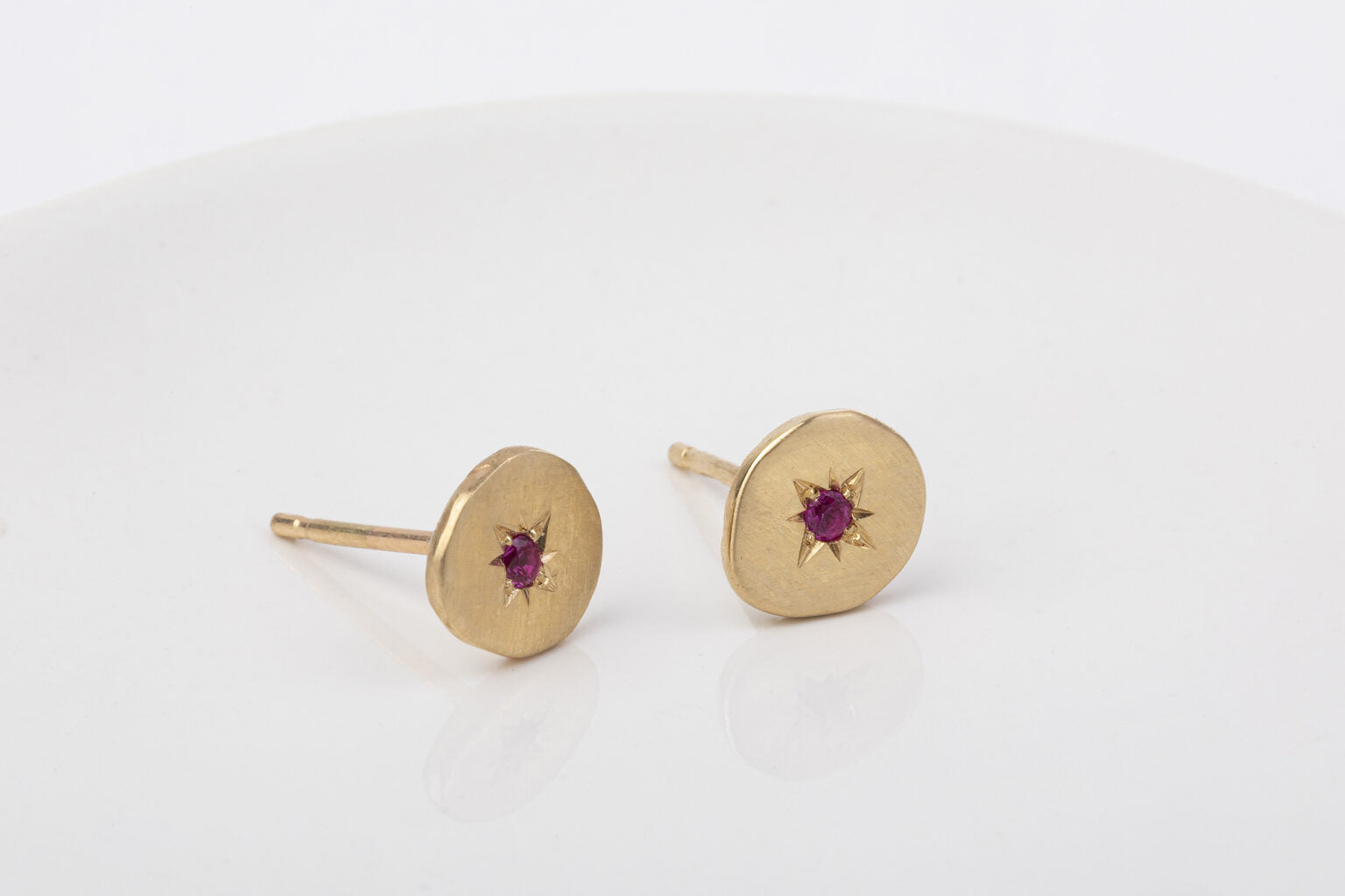 עגיל זהב עדין בצורת עיגול אמורפי המשובץ אבן רובי בשיבוץ כוכב. העגיל עשוי בעבודת יד מוקפדת בסטודיו שלנו בתל אביב ולכן יכולים להיות שינויים קלים בצורתם.
