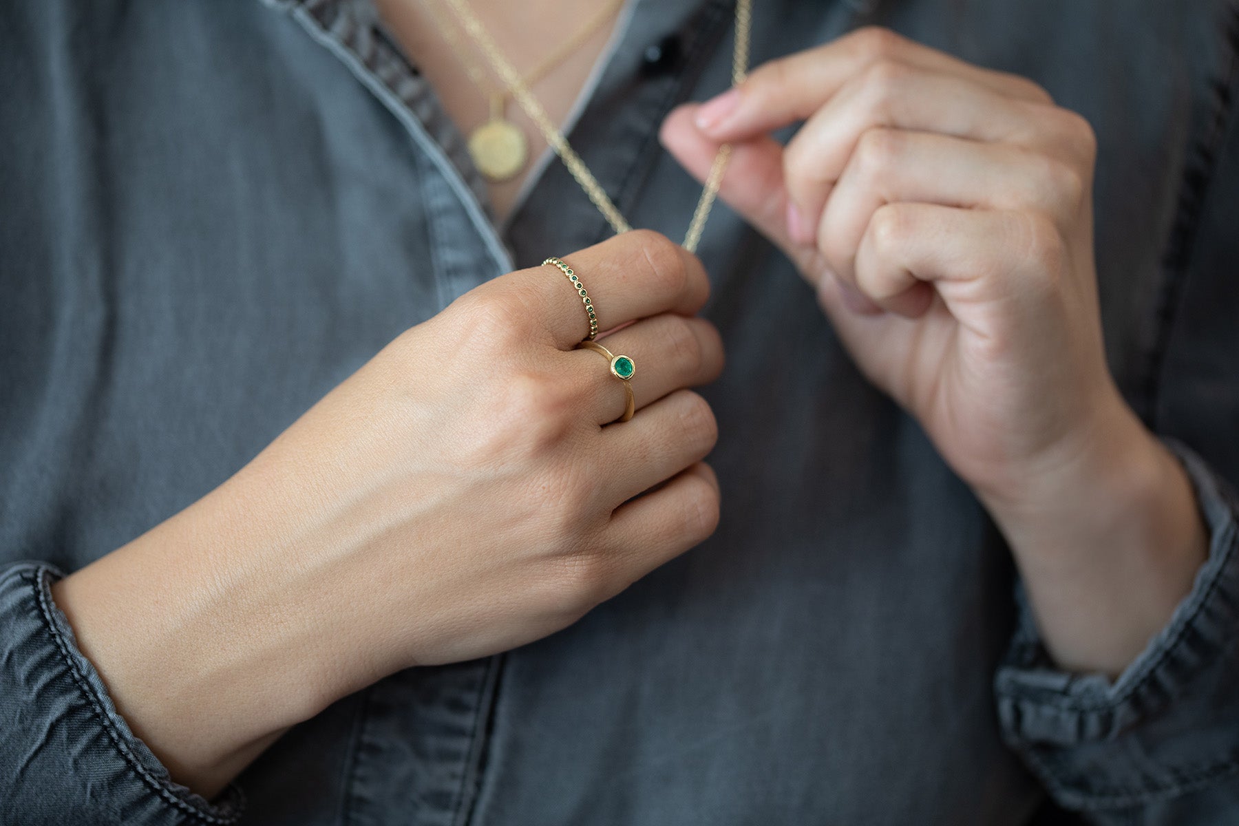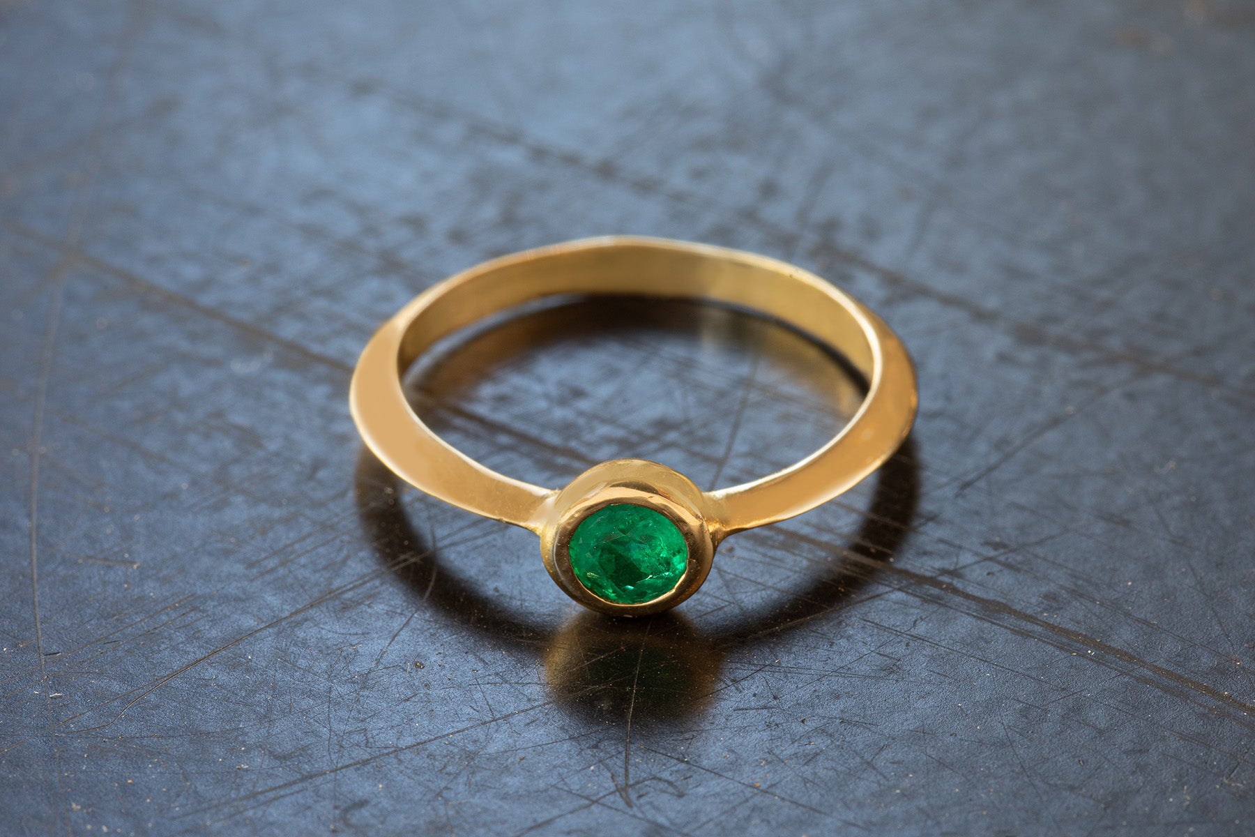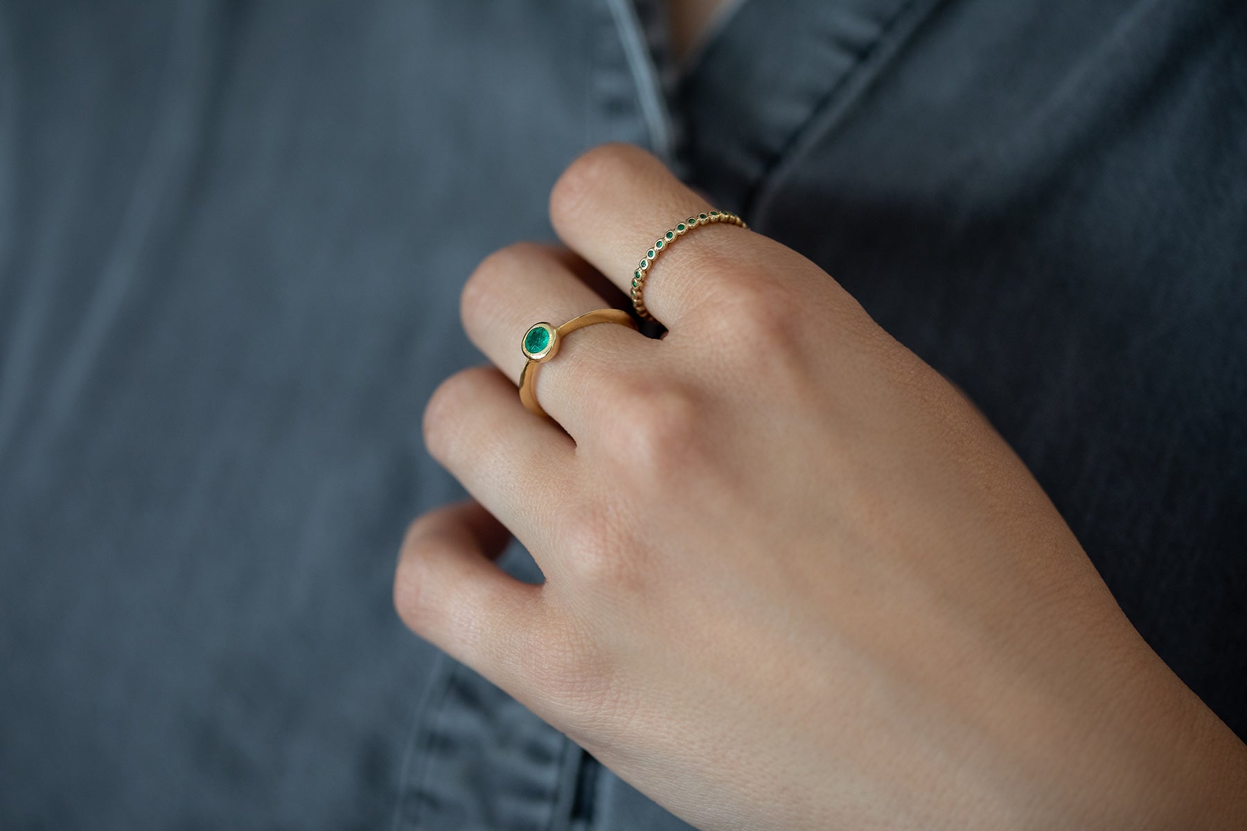 טבעת ליזי היא טבעת סוליטר מעוצבת המפגישה בין הצורות הגאומטריות עשויה פרופיל משולש ומיוחד, משובצת אמרלד עגול ירוק ומהמם.