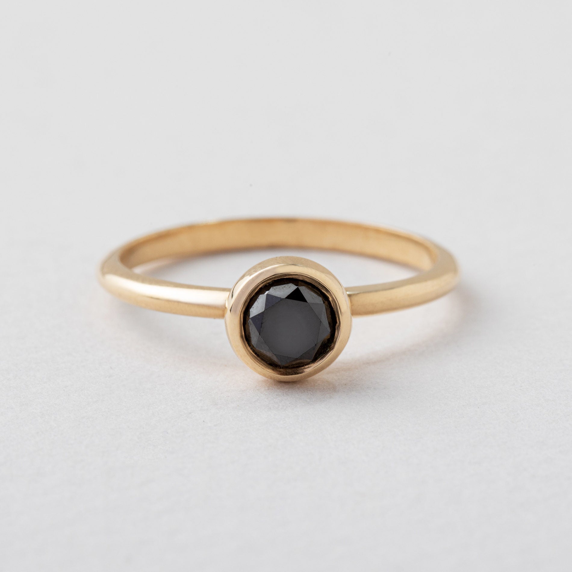 טבעת קלאסית משודרגת, טבעת לונה עשויה זהב 14 קראט ובמרכזה כוס זהב משובצת יהלום שחור מרהיב. טבעת האירוסין הקלאסית מקבלת טוויסט רוק אנד רול.