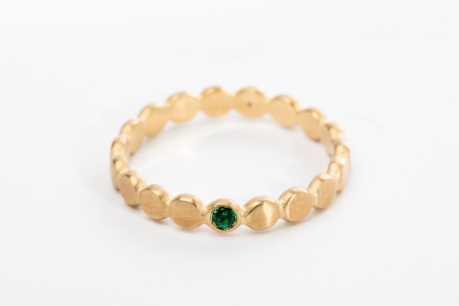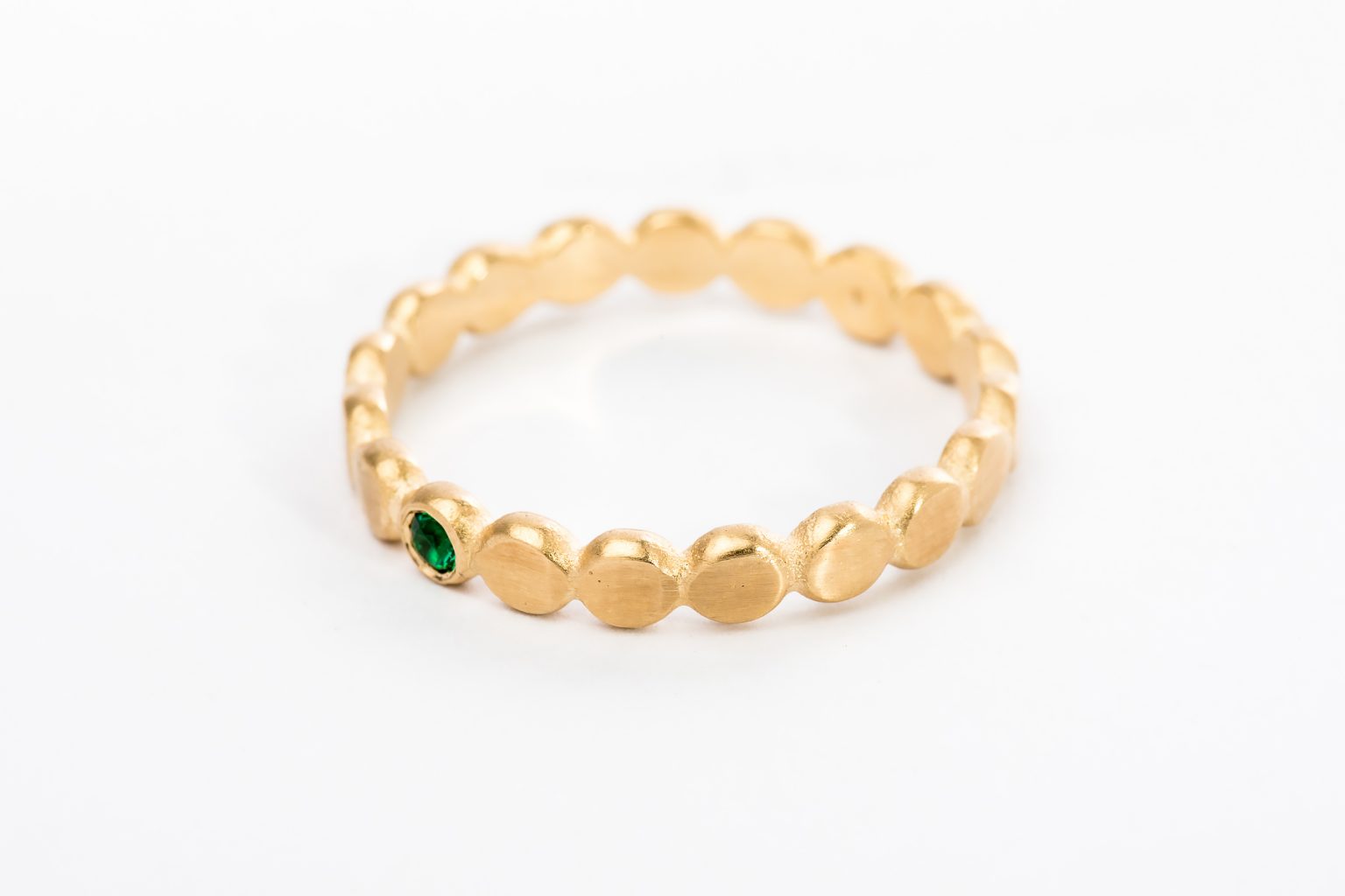 טבעת עיגולי זהב עדינה משובצת באמרלד מקדימה ומאחור. עשויה בעבודת יד איכותית ומוקפדת בסטודיו שלנו, גימור מט. מושלמת עם עוד טבעות או לבד.