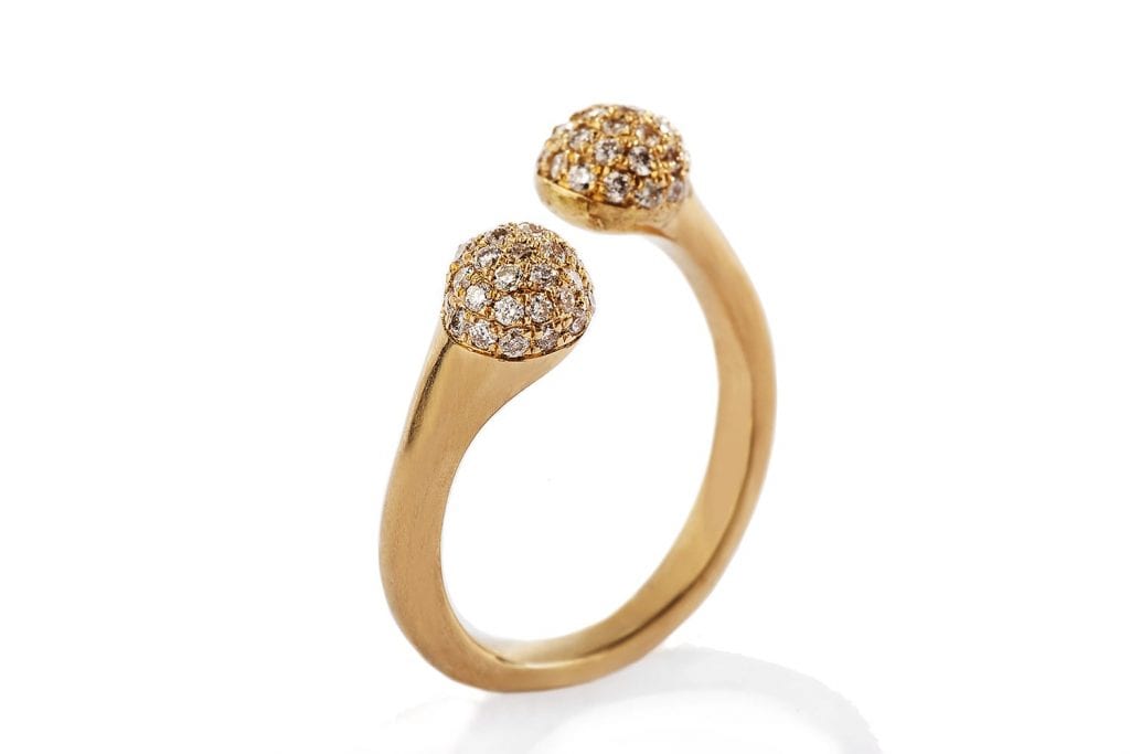טבעת זהב מודרנית ומיוחדת למי שמחפשת משהו יוצא דופן. טבעת זהב פתוחה בעלת פרופיל עגול שמחבקת את האצבע ומסתיימת בכל צד בכיפת זהב שמשובצת ביהלומים.