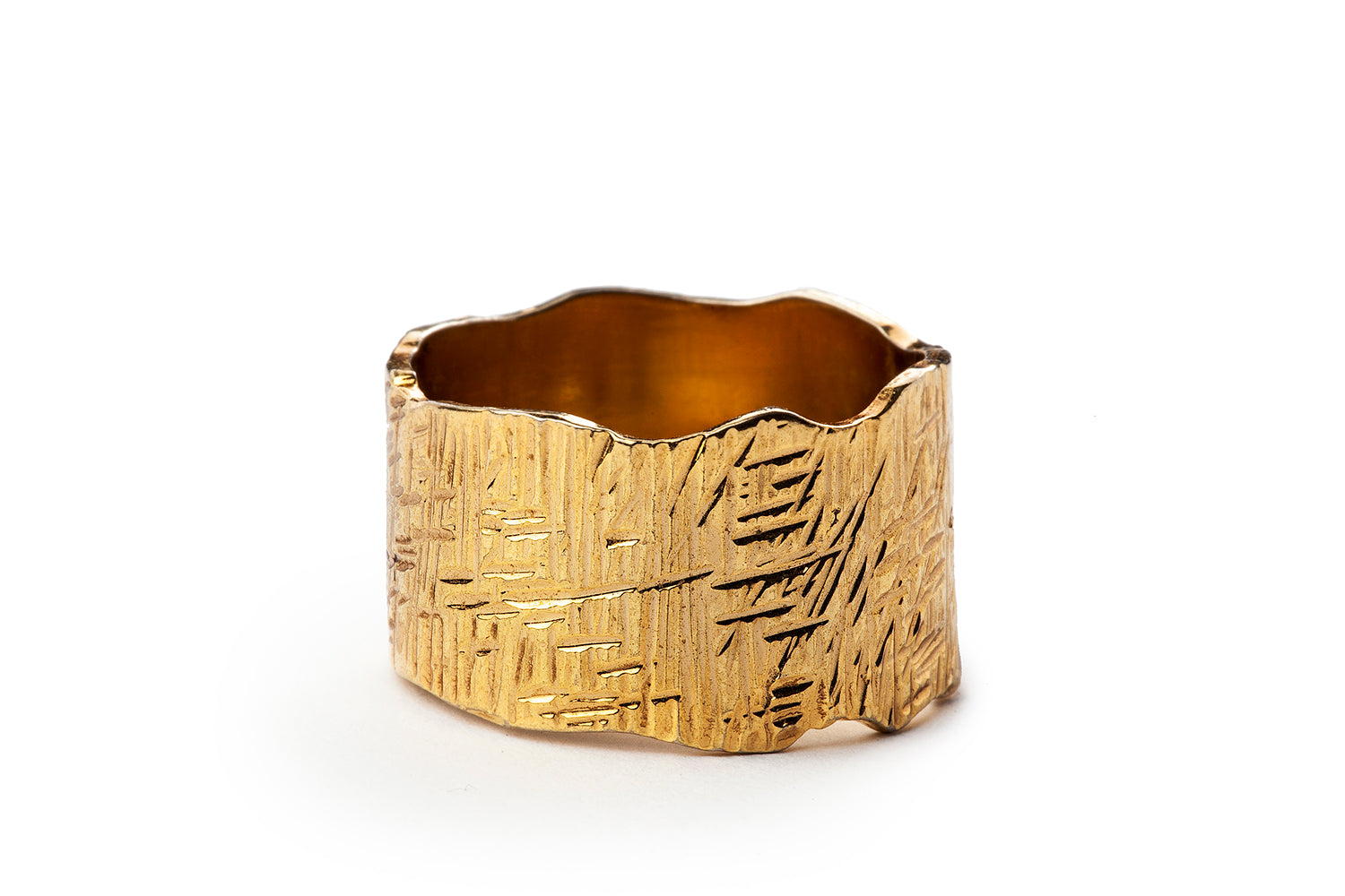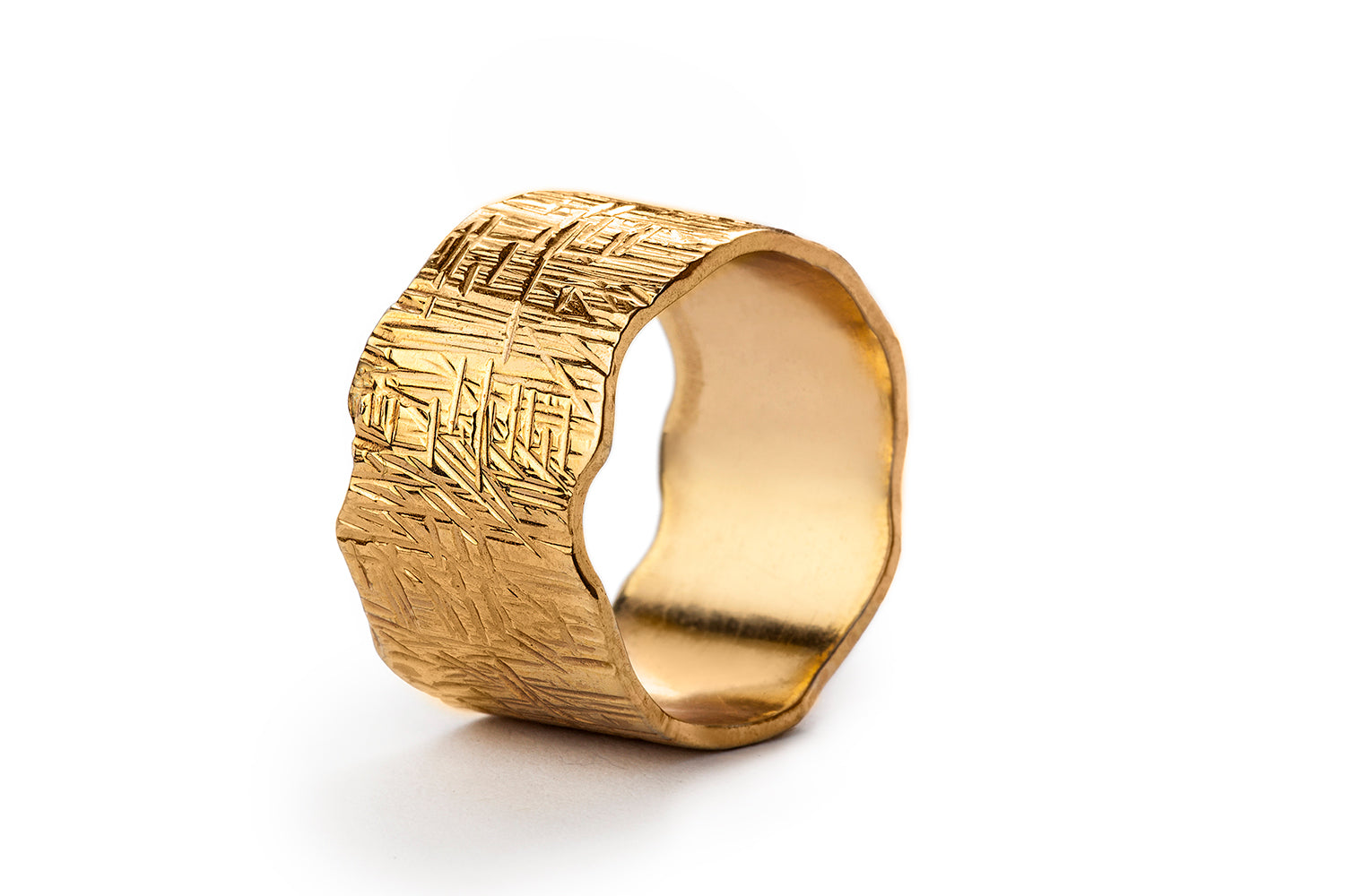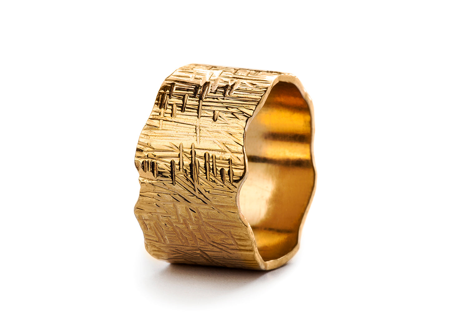 טבעת נישואין רחבה ומרשימה שעליה חרוטה דוגמת קווים שמזכירה לנו נתזים של טיפות גשם פראי. טבעת זהב מיוחדת וגדולה למי שאוהבת נוכחות על האצבע.
