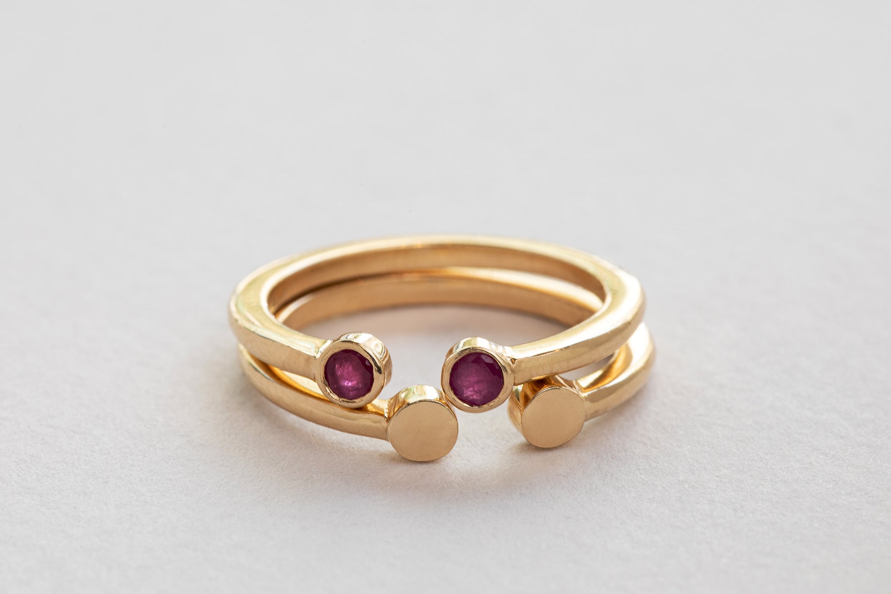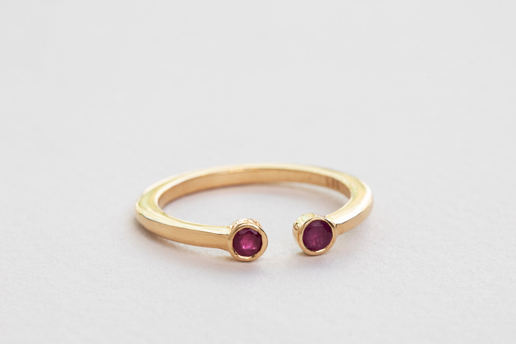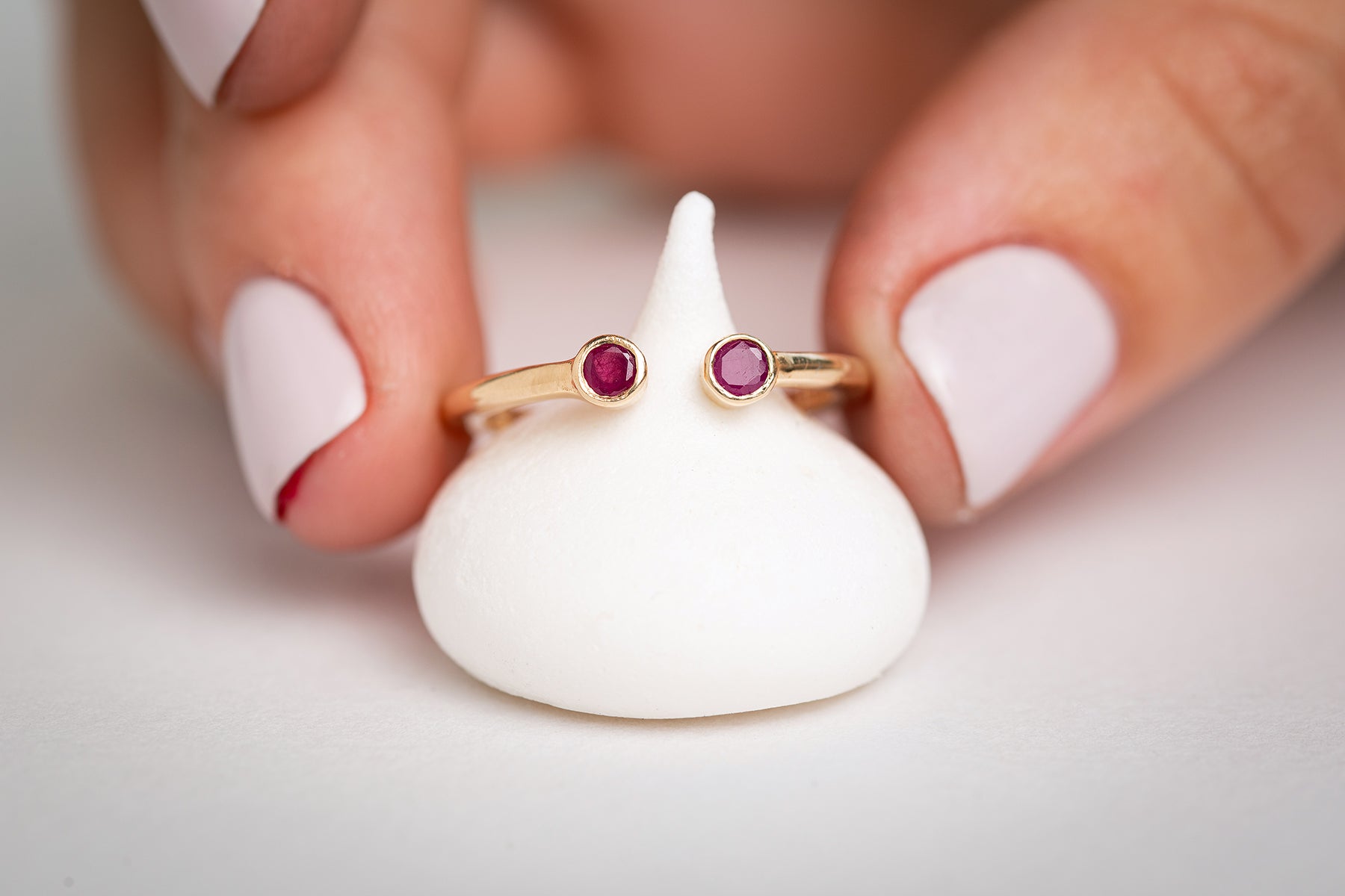 טבעת שילה המושלמת מעניקה לך מראה מתוחכם אבל שקט. טבעת זהב פתוחה שעשויה מפרופיל זהב מושטח ומעוגל שמסתיים בכל צד בכוס זהב המשובצת אבני רובי אדומות. טבעת שילה יפהיפיה לבדה או יחד עם עוד טבעות שמשלימות אותה.
