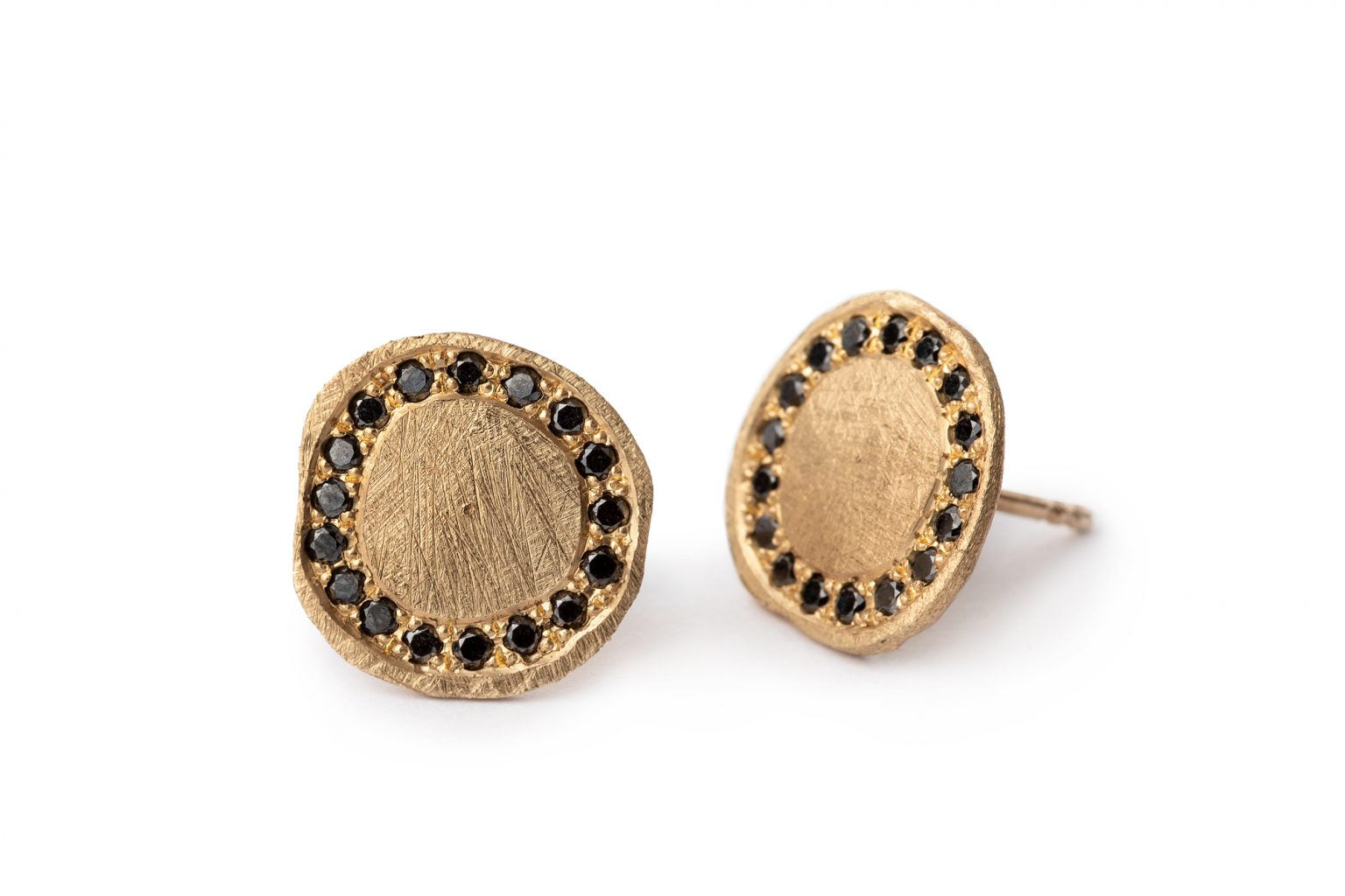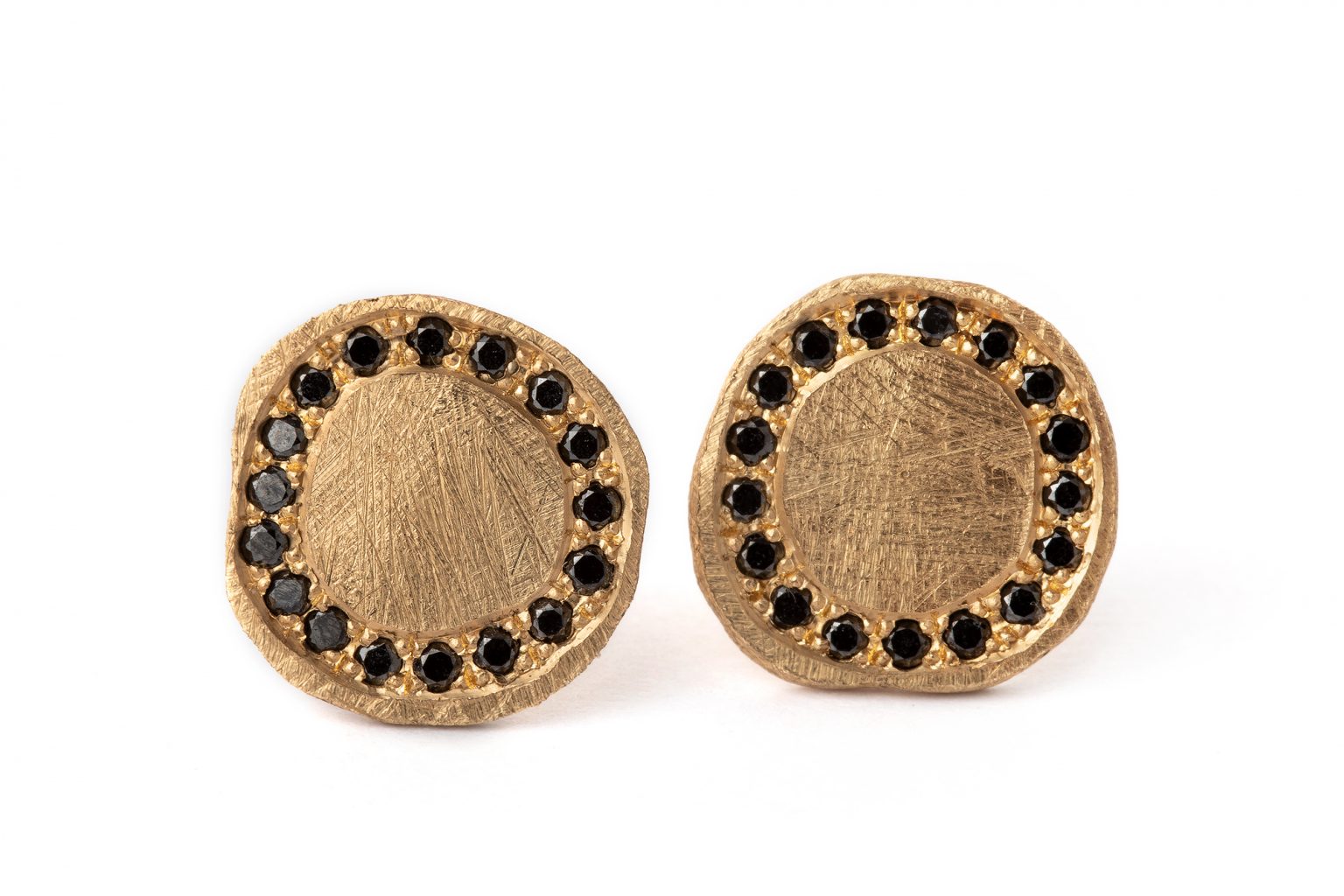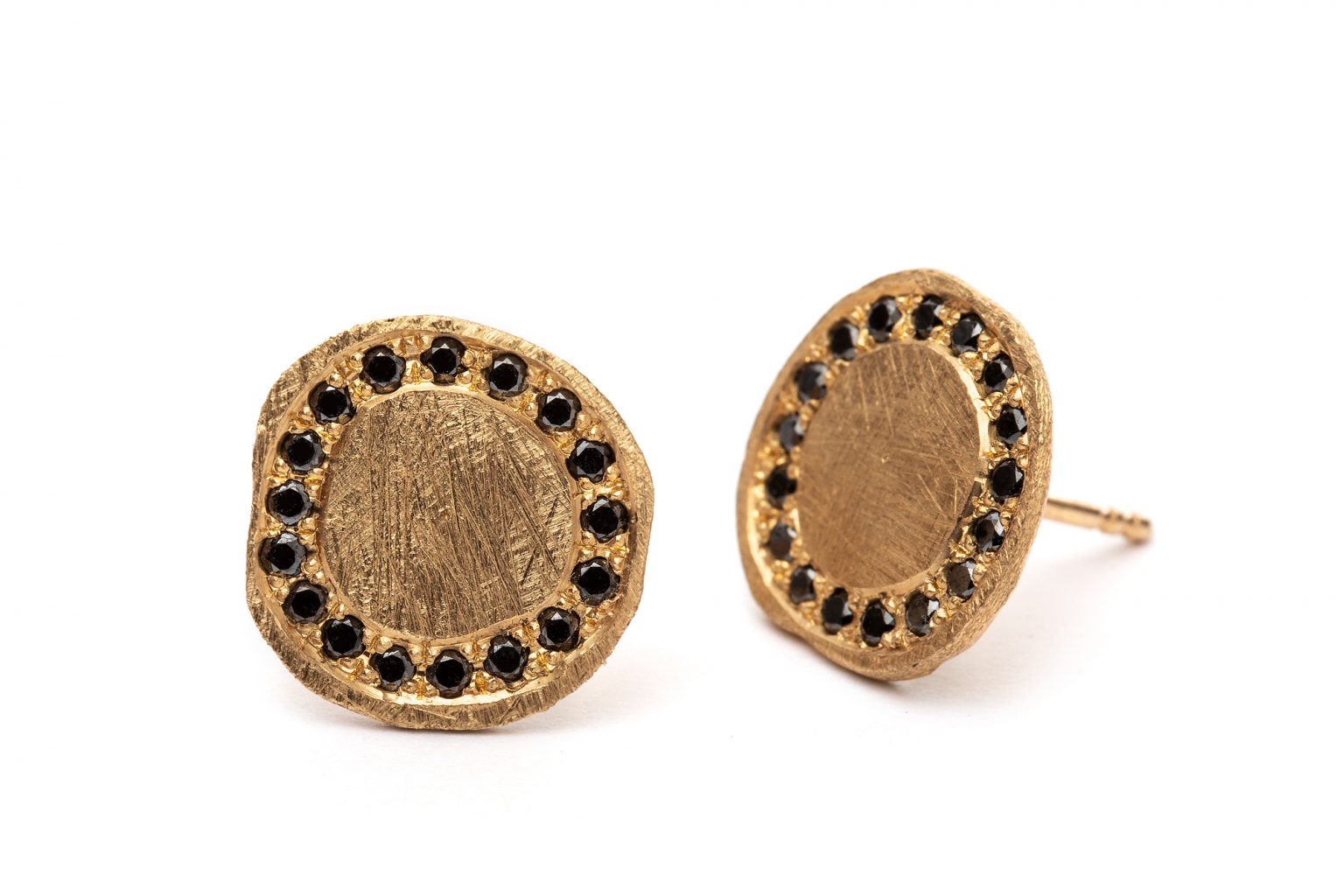 החיבור האולטימטיבי בין זהב ויהלומים שחורים לא מאכזב אף פעם ובמיוחד על האוזן. הכירי את עגילי סטאר, עגילי זהב ויהלומים שחורים בצורת עיגול אמורפי מהמם צמוד אוזן. עיגול הזהב עם טקסטורה גולמית שנעשה בעבודת יד בסטודיו שלנו ומשובץ סביב ביהלומים שחורים