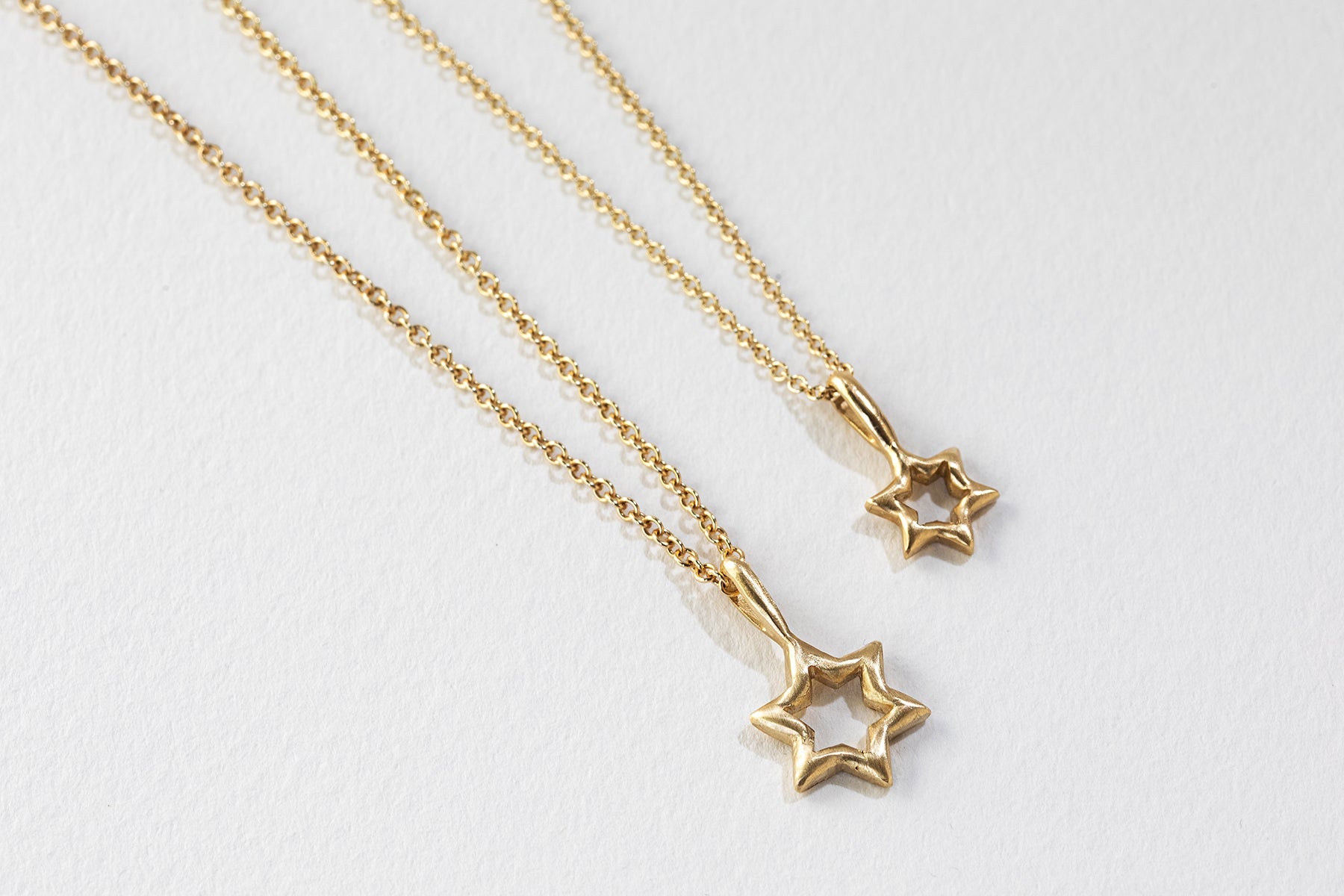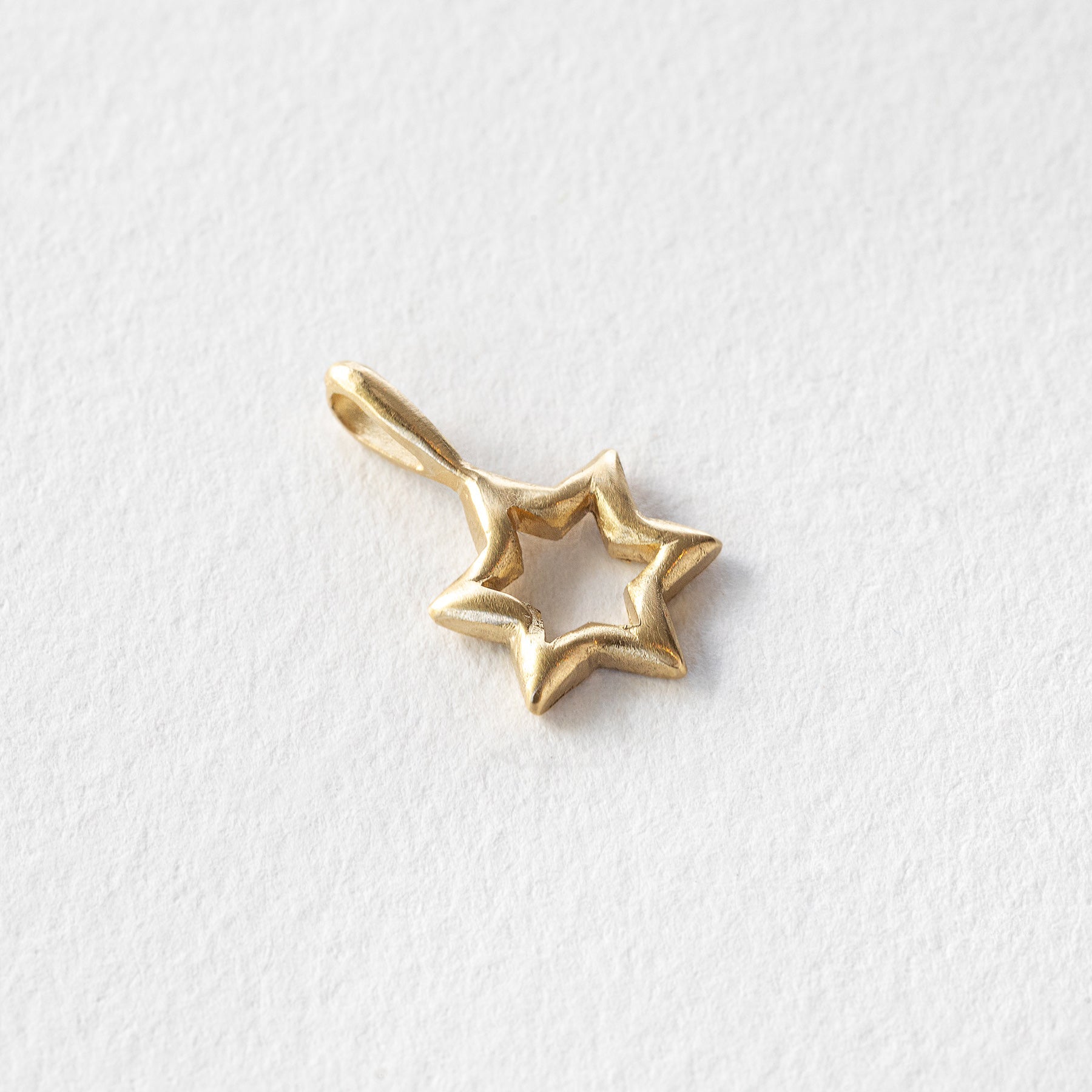 תליון מגן דויד בצורת כוכב מיוחד ועדין עשוי בעבודת יד ייחודית. תליון זהב 14 קראט מפוסל ומרוקע בעבודת יד ובעל גימור מט. התליון העדין הזהמושלם לבד או עם עוד תליונים. מגיע על שרשרת חוליות זהב עדינות 14 קראט