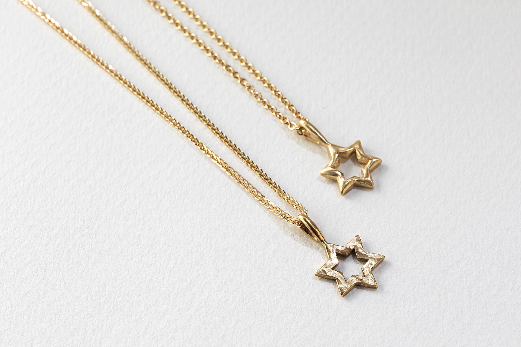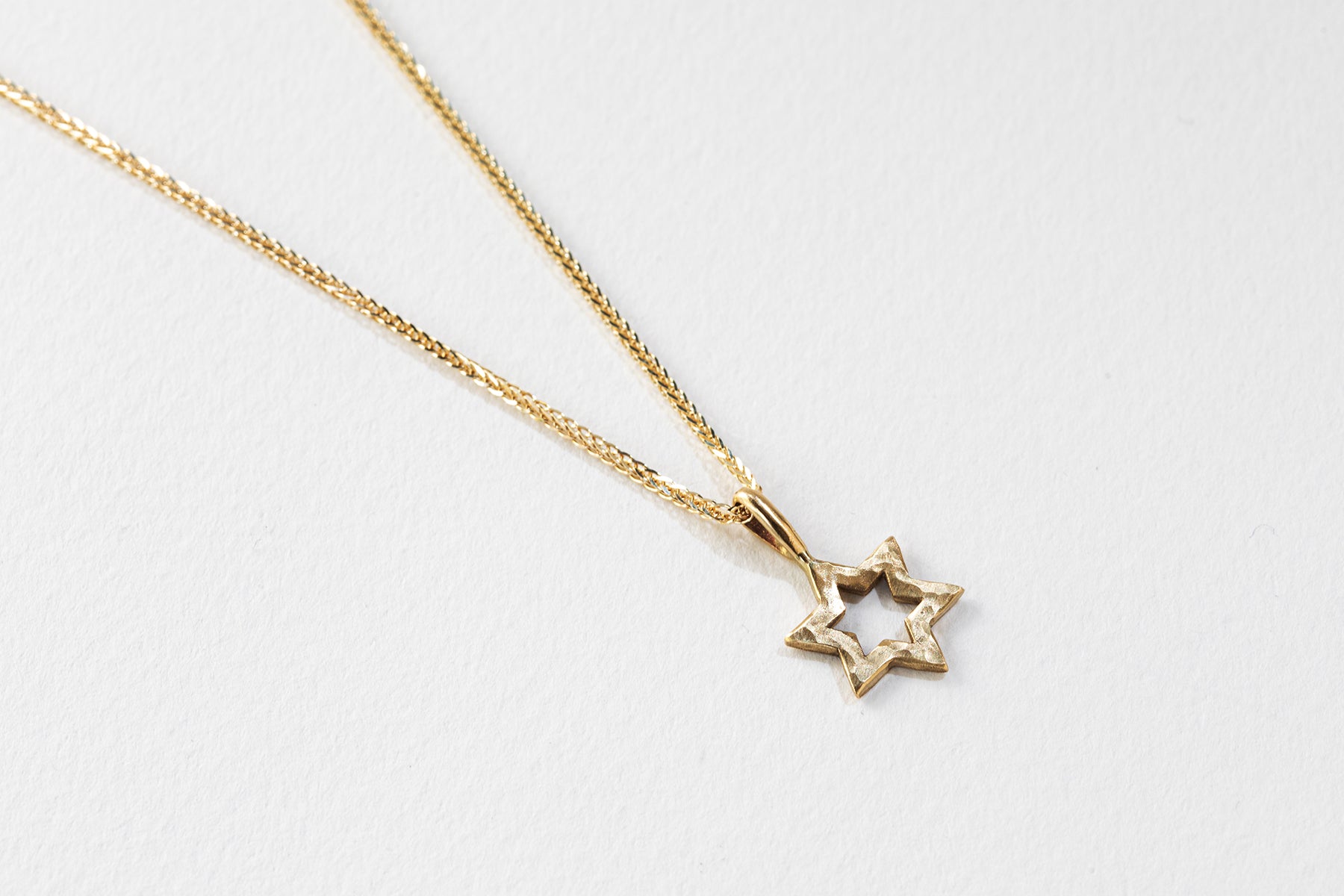 שרשרת חוליות זהב עדינה עם תליון מגן דויד בצורת כוכב מיוחד ועדין. התליון עשוי בעבודת יד ייחודית בזהב 14 קראט. מפוסל ומרוקע בעבודת יד ובעל גימור מט לא תמצאי תליון מגן דויד מיוחד יותר. התליון יפהיפה ומושלם לבד או עם עוד תליונים