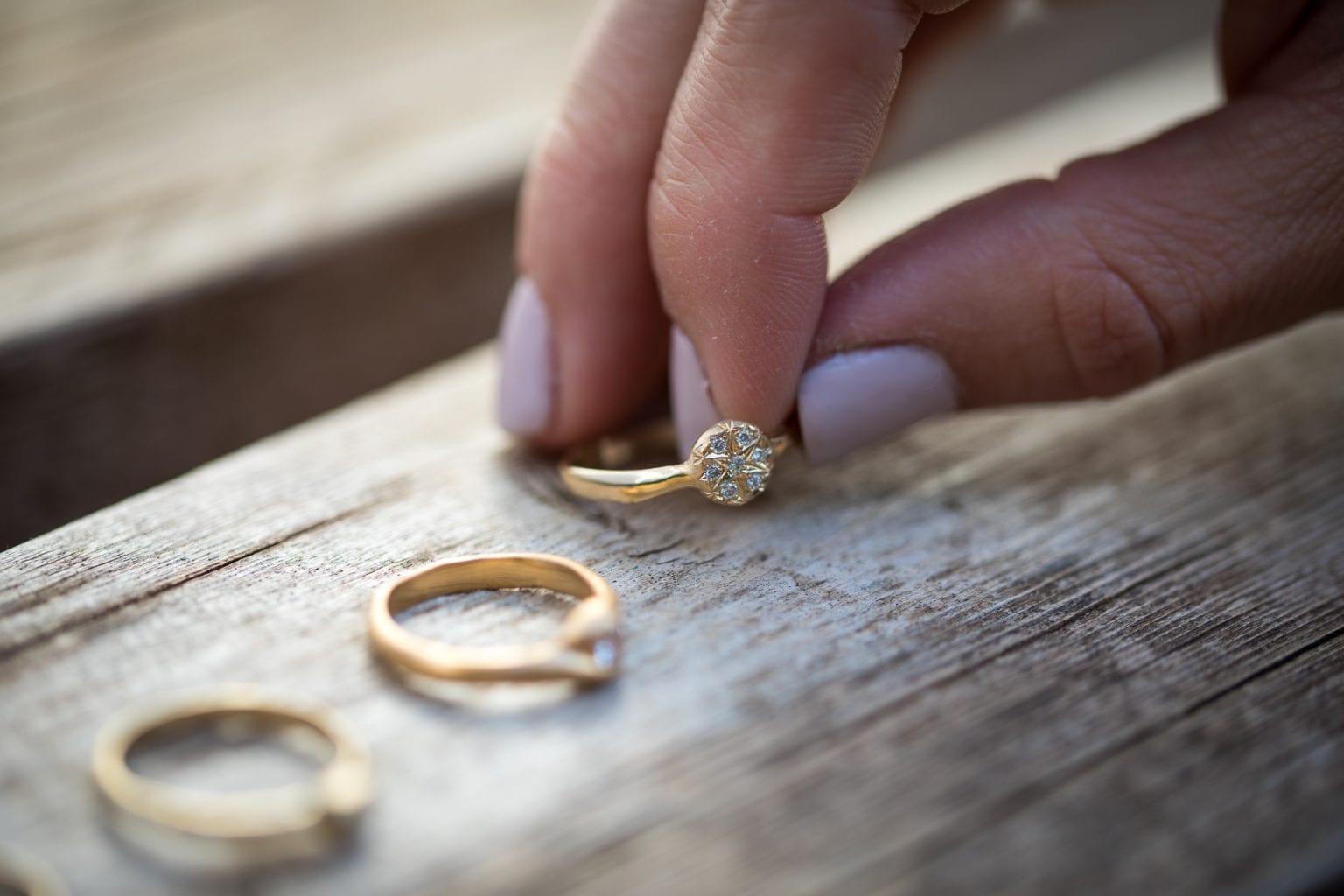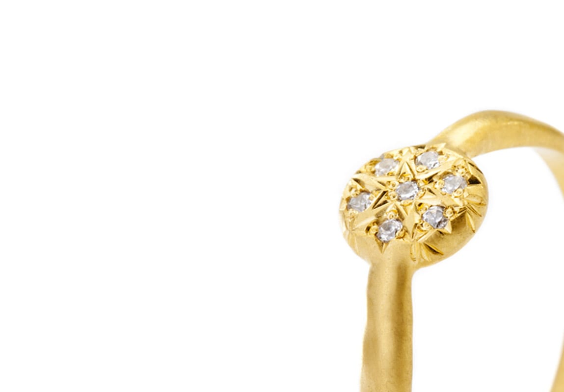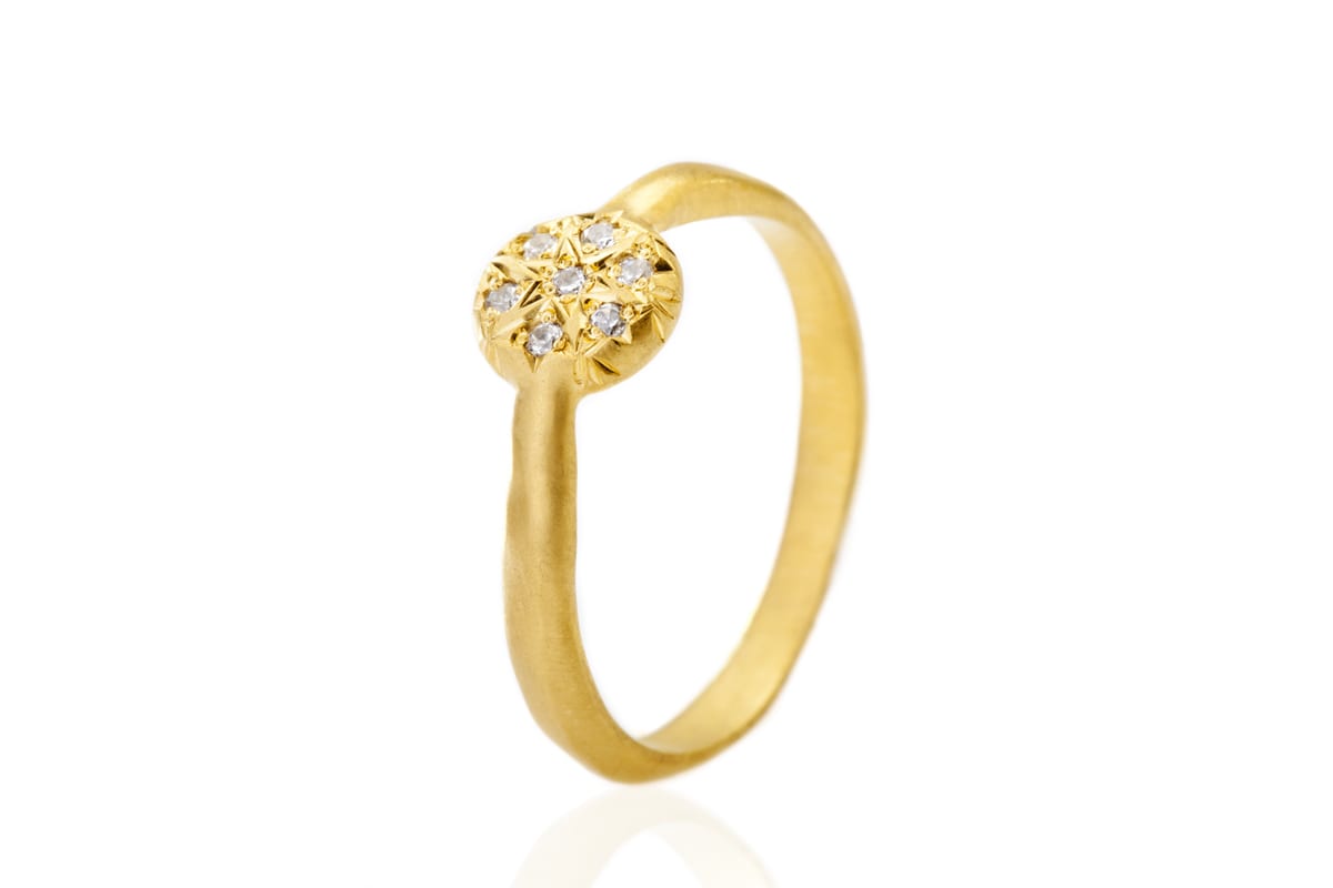 טבעת ייחודית למי שמחפשת משהו קצת אחר. הטבעת שעשויה בעבודת יד בסטודיו שלנו בעלת מבנה גולמי לא אחיד ובמרכזה עיגול זהב לא סימטרי משובץ יהלומים. היוצרים צורת כוכב
