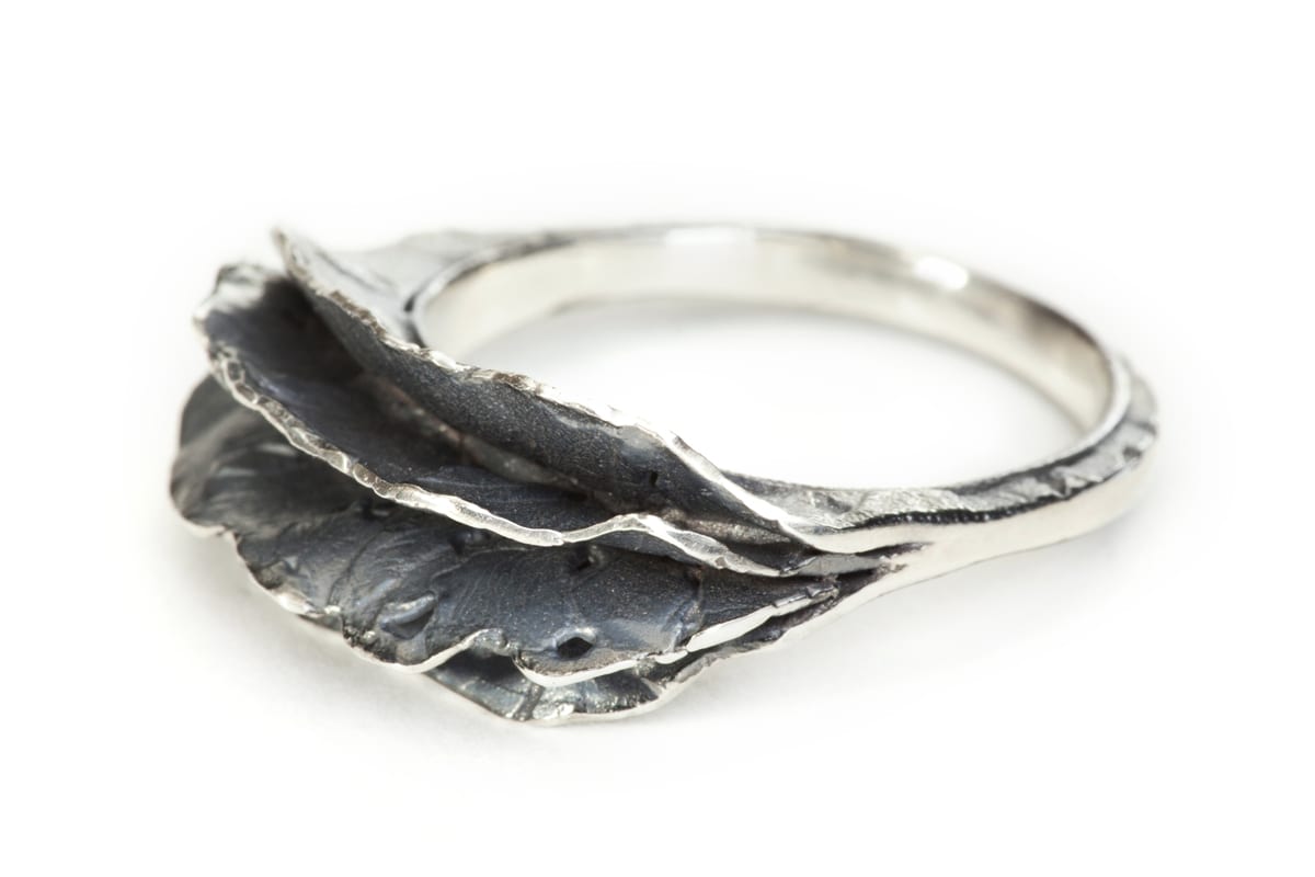 ארבע שכבות של חומר מאוחדות יחד בטבעת כסף מושחר מיוחדת ומעוצבת בעבודת יד בסטודיו. קולקציית הוולקאנו מביאה תנועה קפואה של לבה ואדמה אל החומר ושמה דגש על מראה גולמי וייחודי של התכשיט.