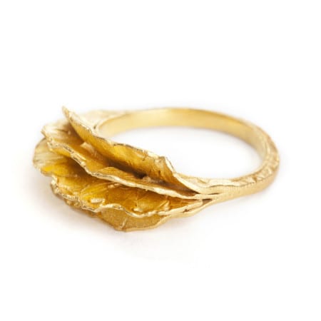 ארבע שכבות של חומר מאוחדות יחד בטבעת זהב מיוחדת ומעוצבת בעבודת יד בסטודיו שלנו בתל אביב. קולקציית הוולקאנו מדמה תנועה קפואה של לבה ואדמה בתוך החומר ושמה דגש על מראה גולמי וייחודי של התכשיטים