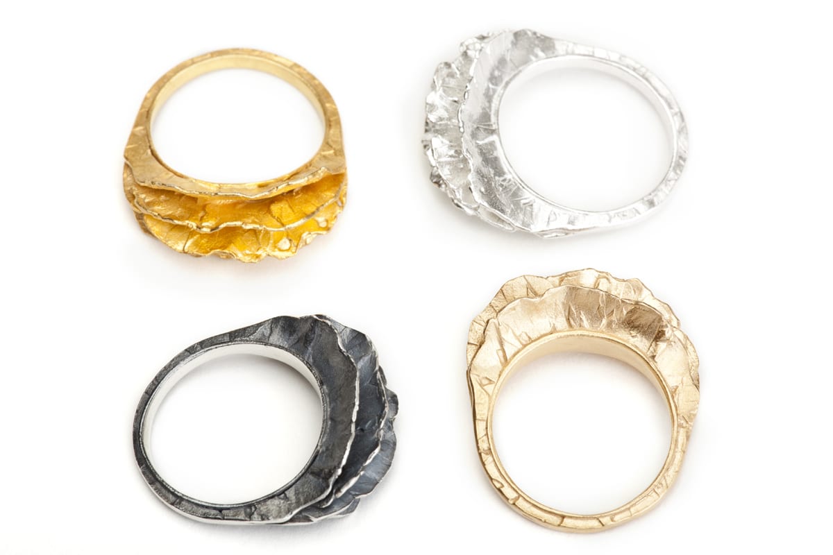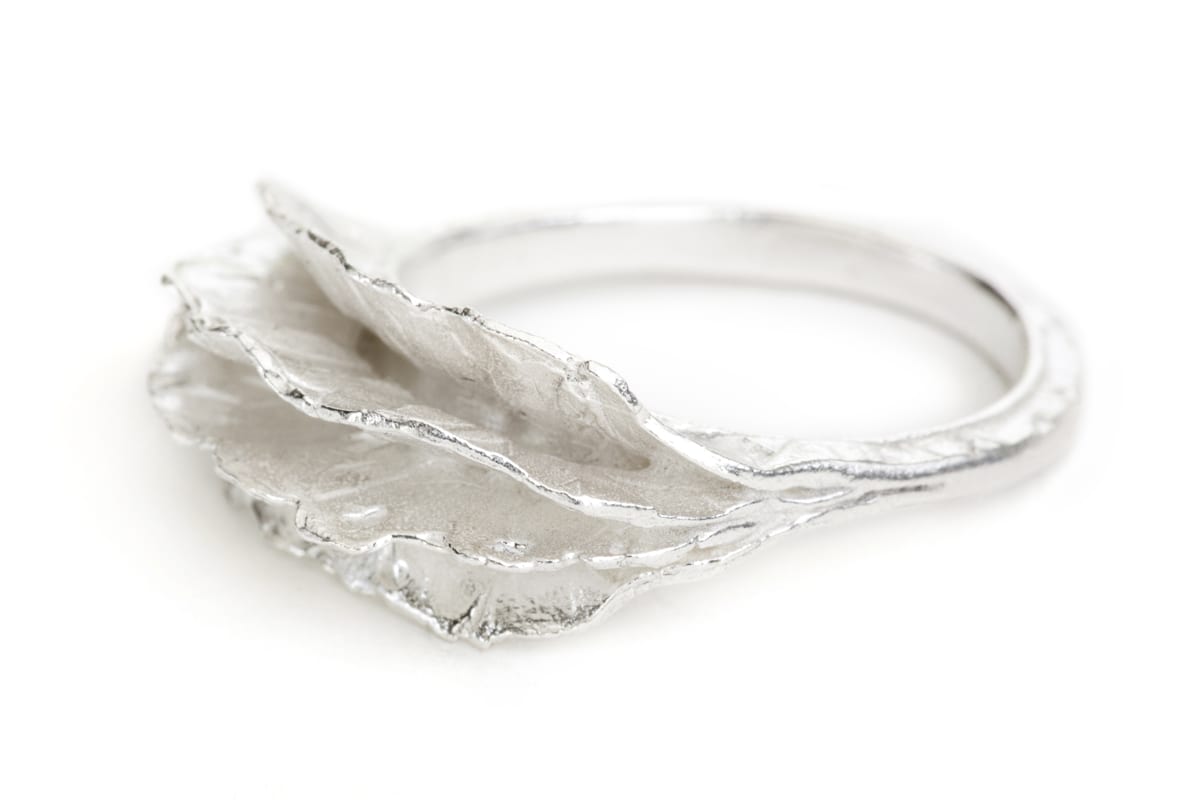 טבעת וולקאנו המיוחדת עשוייה מארבעה עליי כסף בטקסטורת וולקאנו שנעשו בעבודת יד וחוברו יחד לטבעת מרשימה.